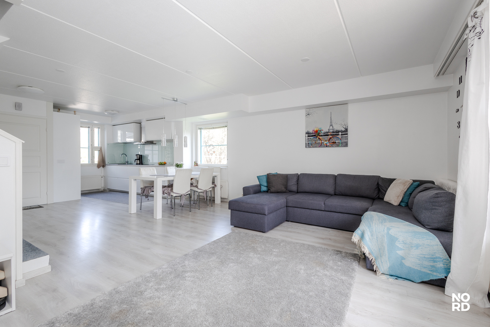 Alakerta on kokonaan remontoitu v. 2021 avaraksi keittiö-ruokailu-olohuonetilaksi, ja on erittäin valoisa, sillä päätyhuoneistossa on kolmeen suuntaan ikkunat.