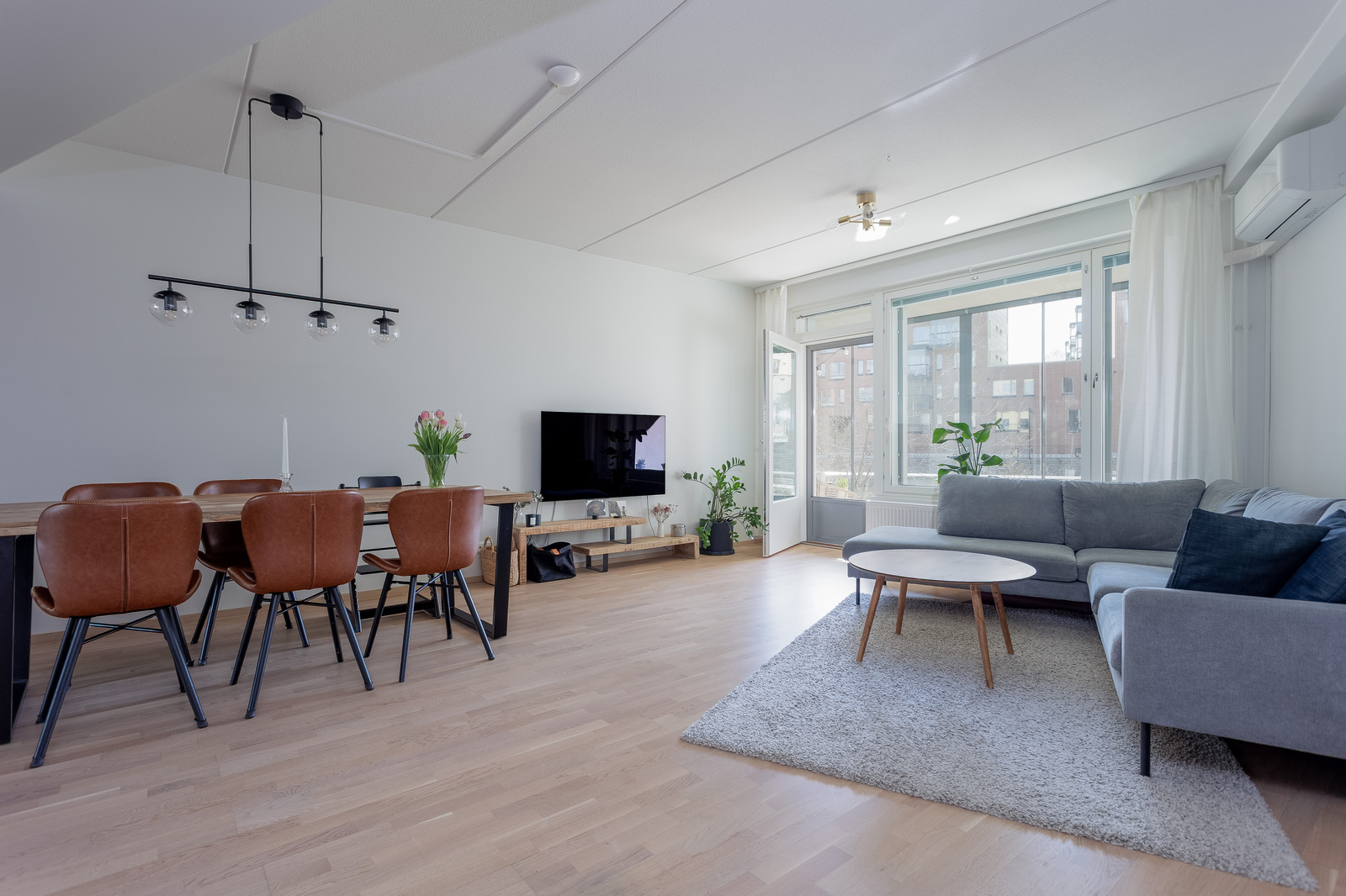 Tilava ja suojaisa lasitettu terassi avautuu yhtiön omalle viihtyisälle piha-alueelle, josta on suora yhteys puistoon. Ihanteellinen ympäristö lapsiperheille ja koiranomistajille. Asunto on harvinaisen väljä ja muuntautuu joustavasti erilaisiin elämäntilanteisiin. Ikkunallinen sauna, laadukkaat pintamateriaalit sekä Puustellin keittiö integroiduilla kodinkoneilla viimeistelevät kokonaisuuden.