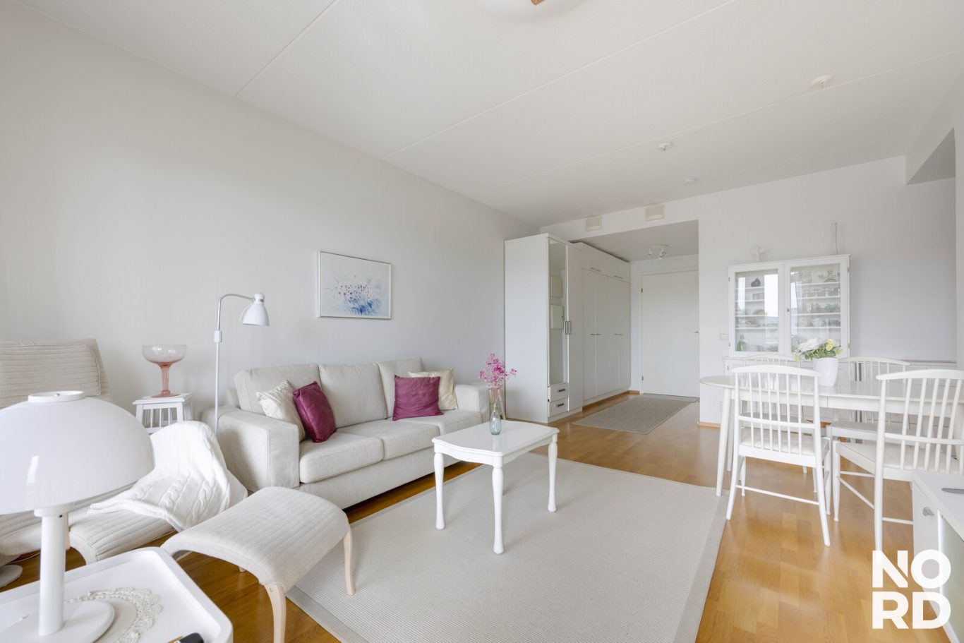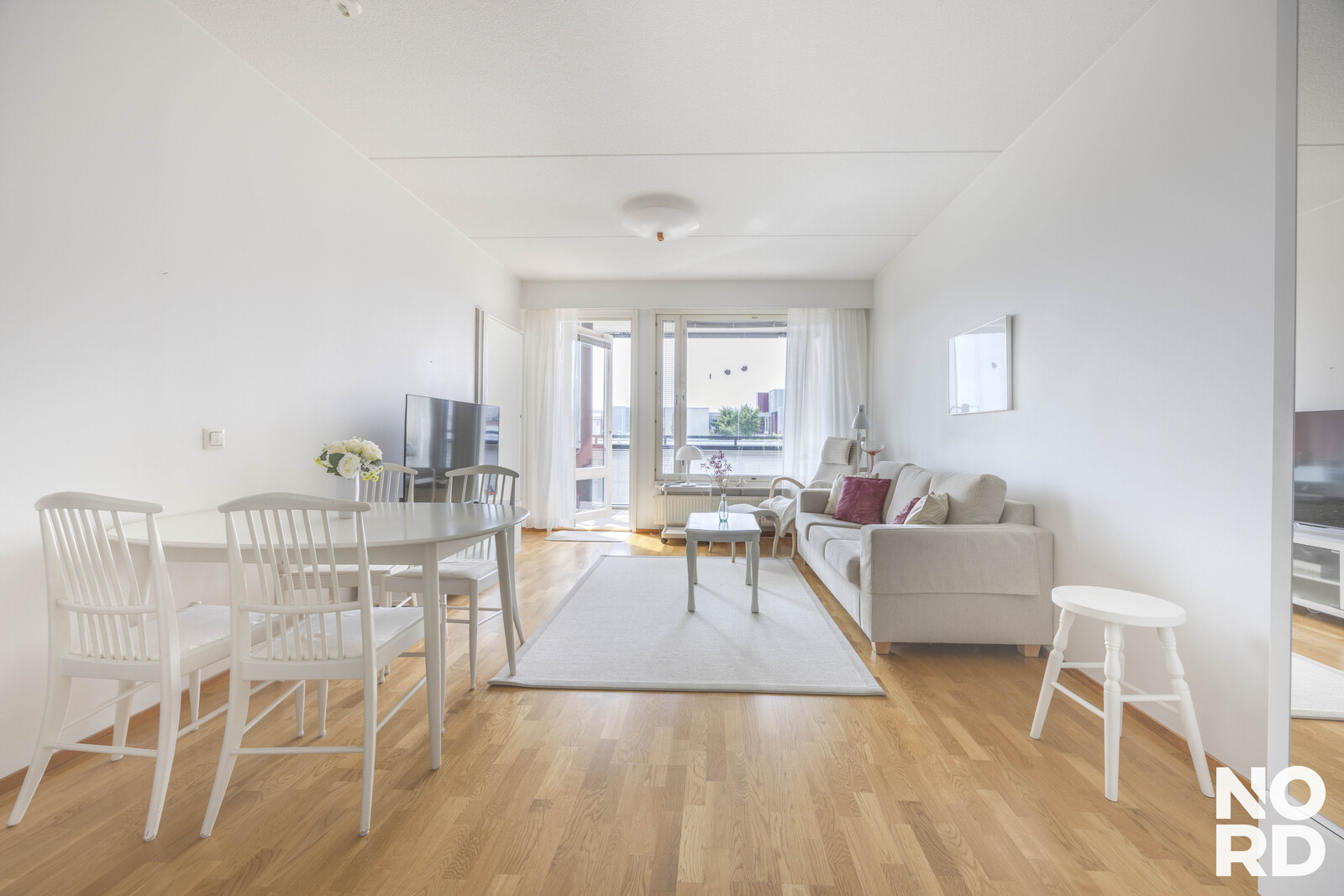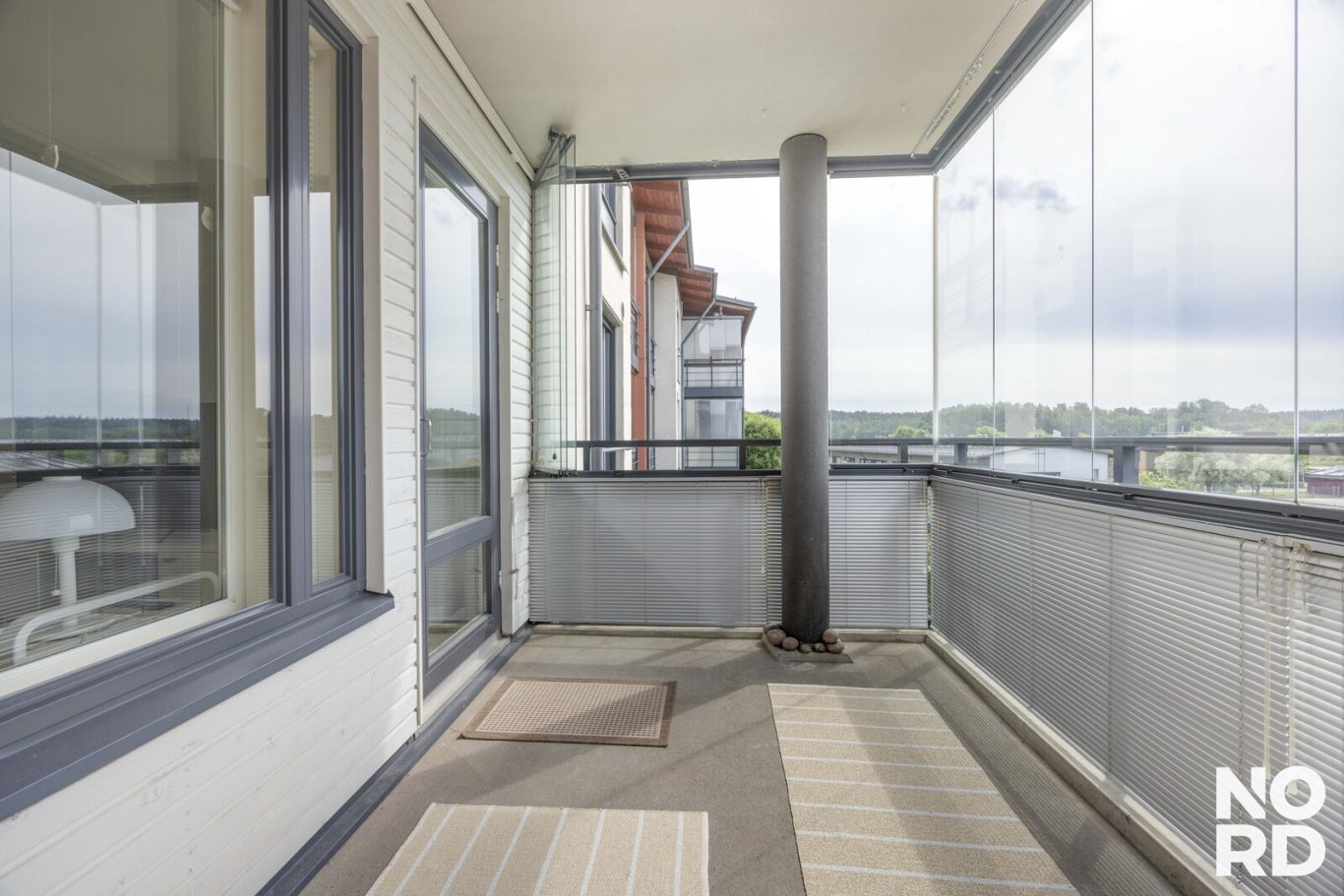 The immediately available apartment features a glazed south-facing balcony with open, garden-like views, a private sauna, and a clever floor plan with a functional kitchen space and a cozy dining nook.