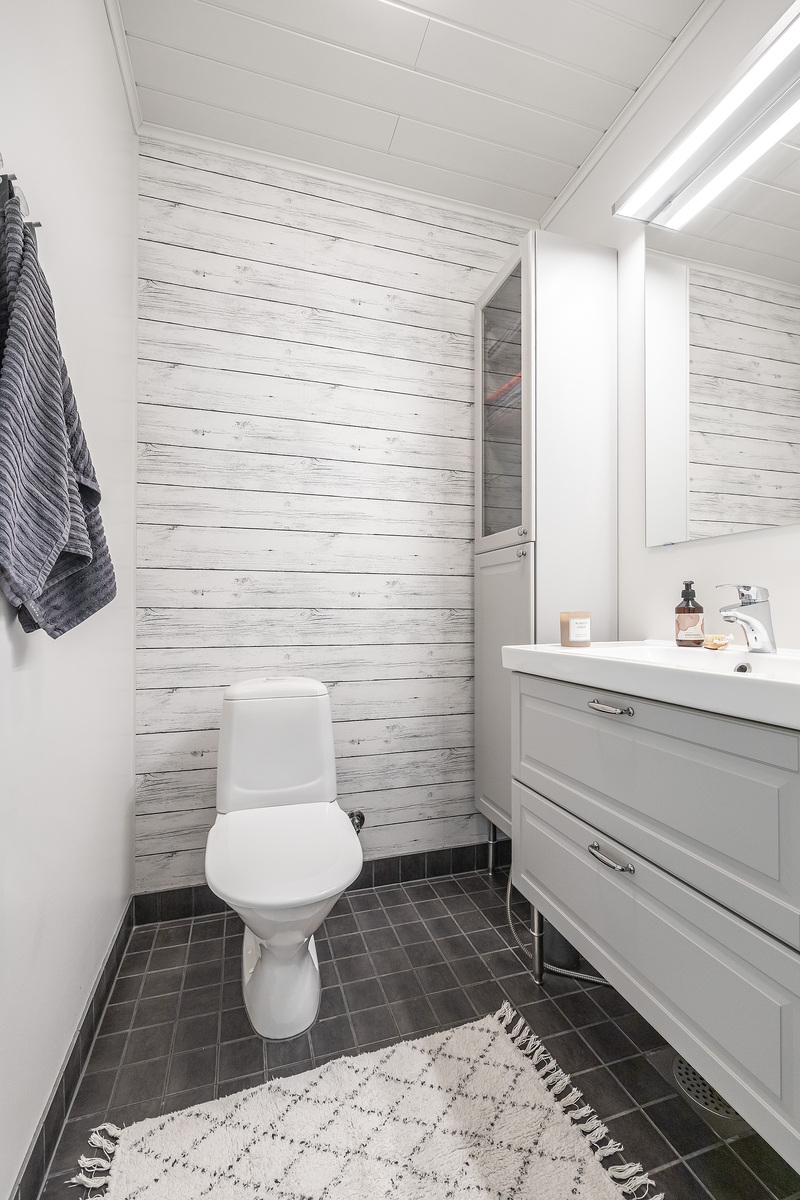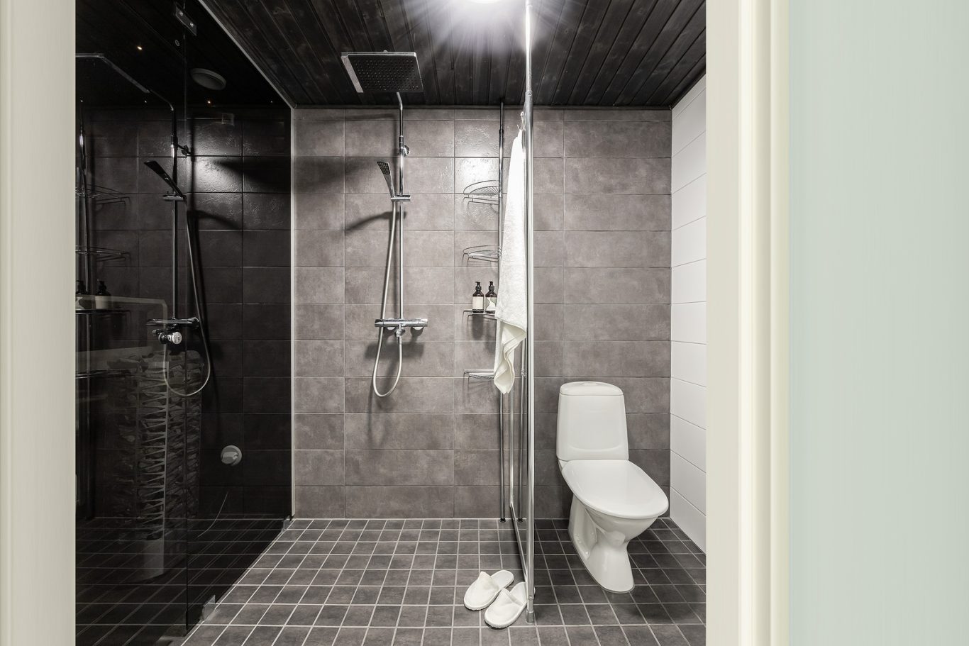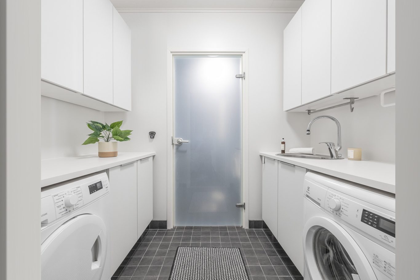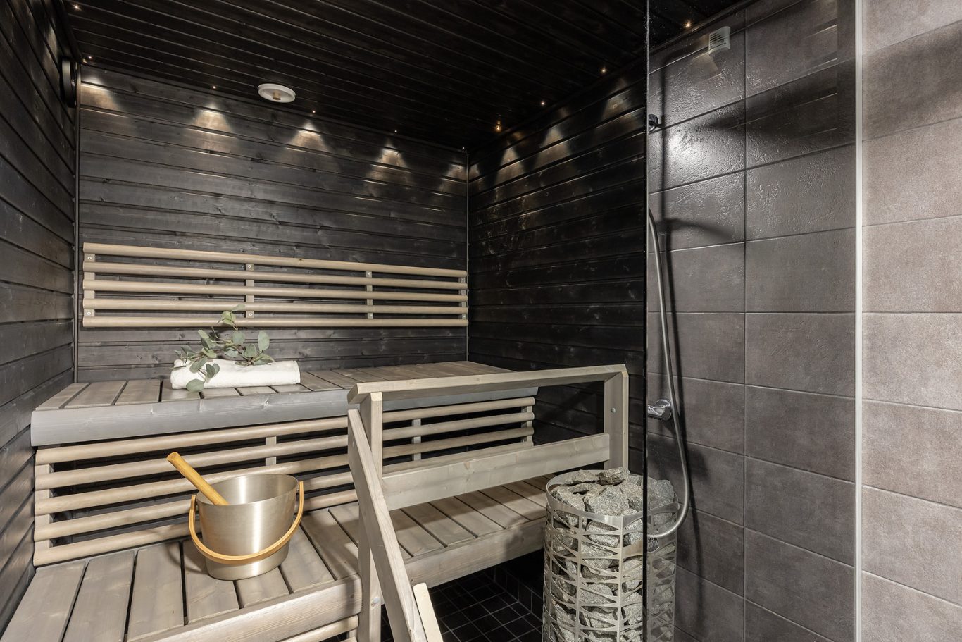 Tyylikäs saunaosastto ja tehokas kodinhoitotila, koneet sisältyvät kauppaan, Erillinen wc.