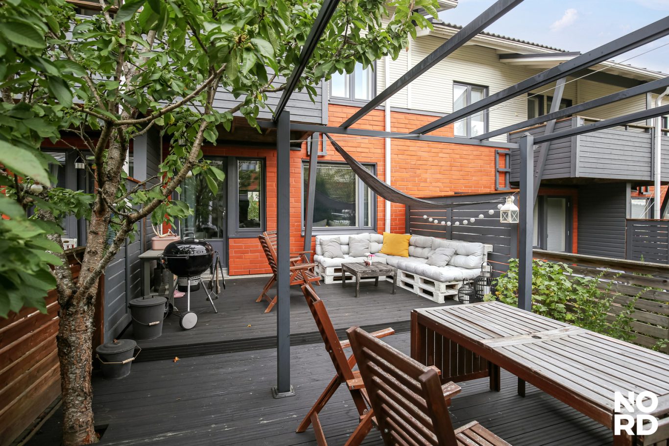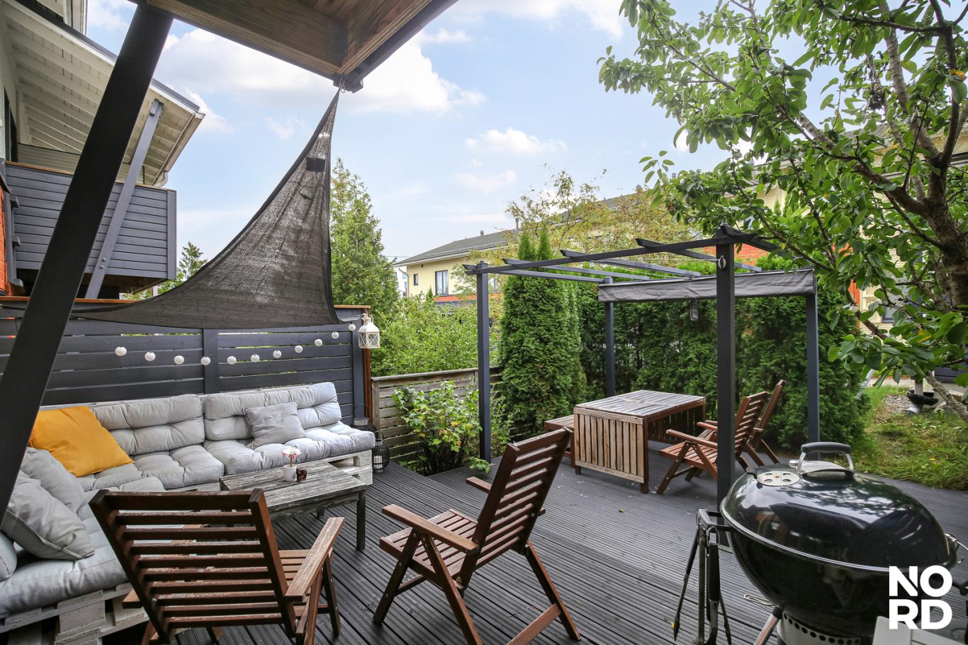 Iso, suojaisa terassi täydellinen paikka rentoutua ja nauttia kesäpäivistä.