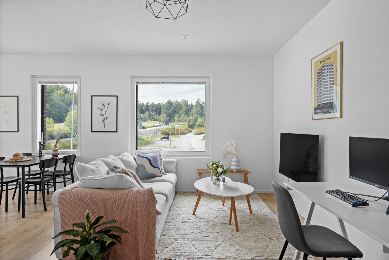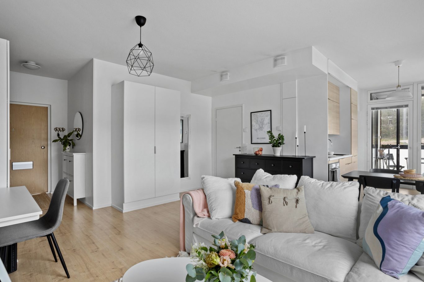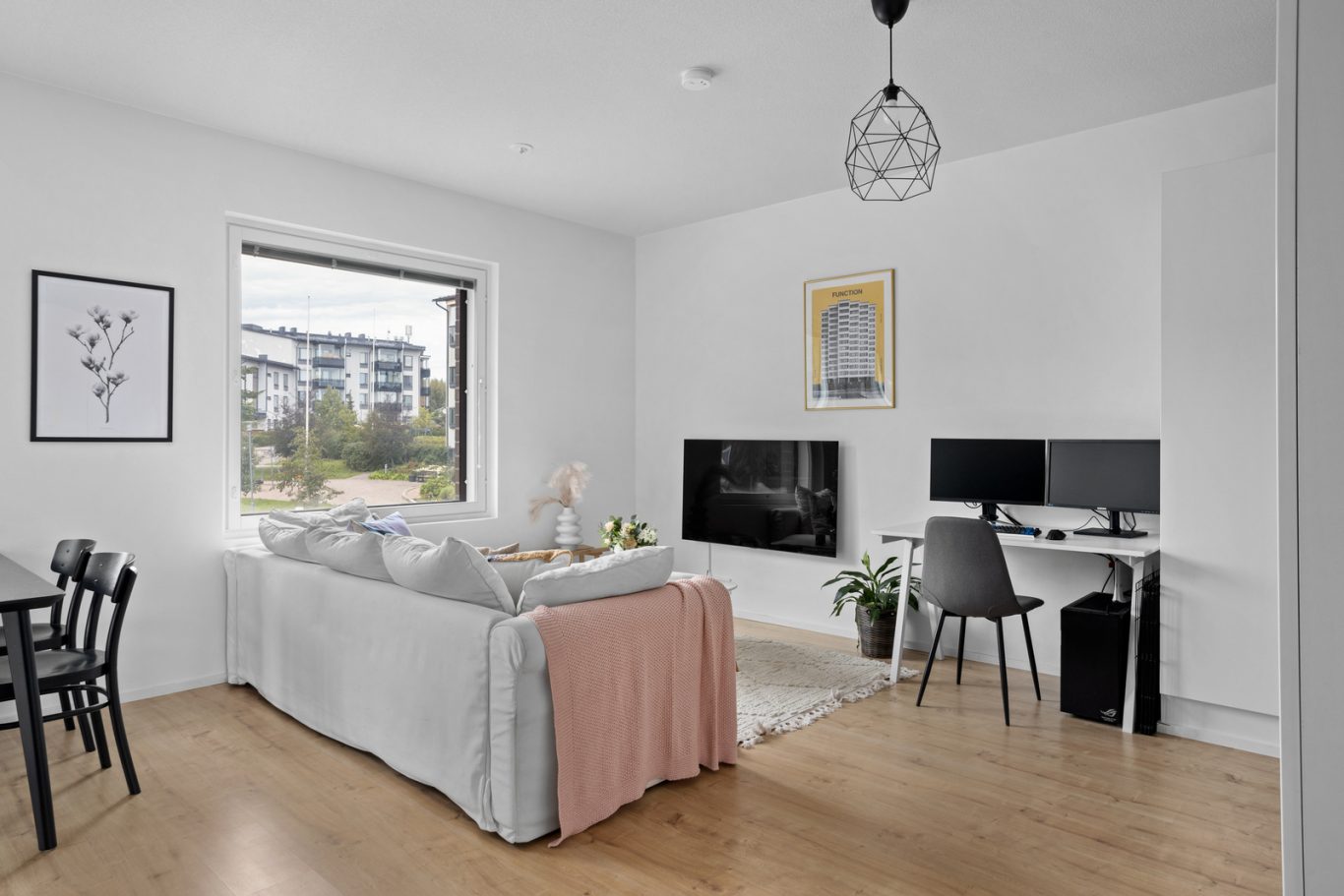 Valoisa olohuone, joka on moneen tapaan sisustettavissa. Makuuhuone, jonne mahtuu hyvin parisänky tai vaikkapa erillinen työpiste. Moderni kylpyhuone, jonne mahtuu hyvin myös pesukone. Kompakti tilava kaksio, jossa hyvä pohjaratkaisu.