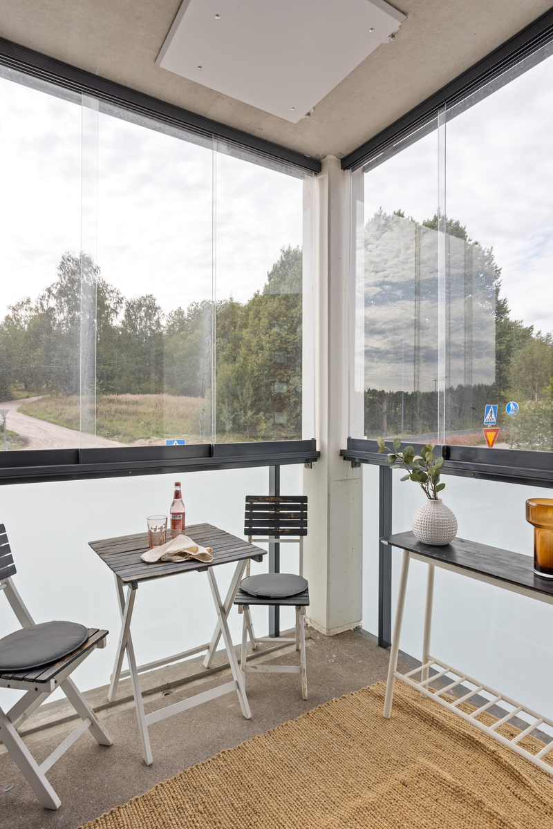 | Tilojen kuvaus | Keittotilasta ja makuuhuoneen vierestä käynti lasitetulle parvekkeelle. Eteinen, jossa naulakko ja kenkäteline sekä vaatekaapit, seinät maalattu ja lattia laminaatti. |