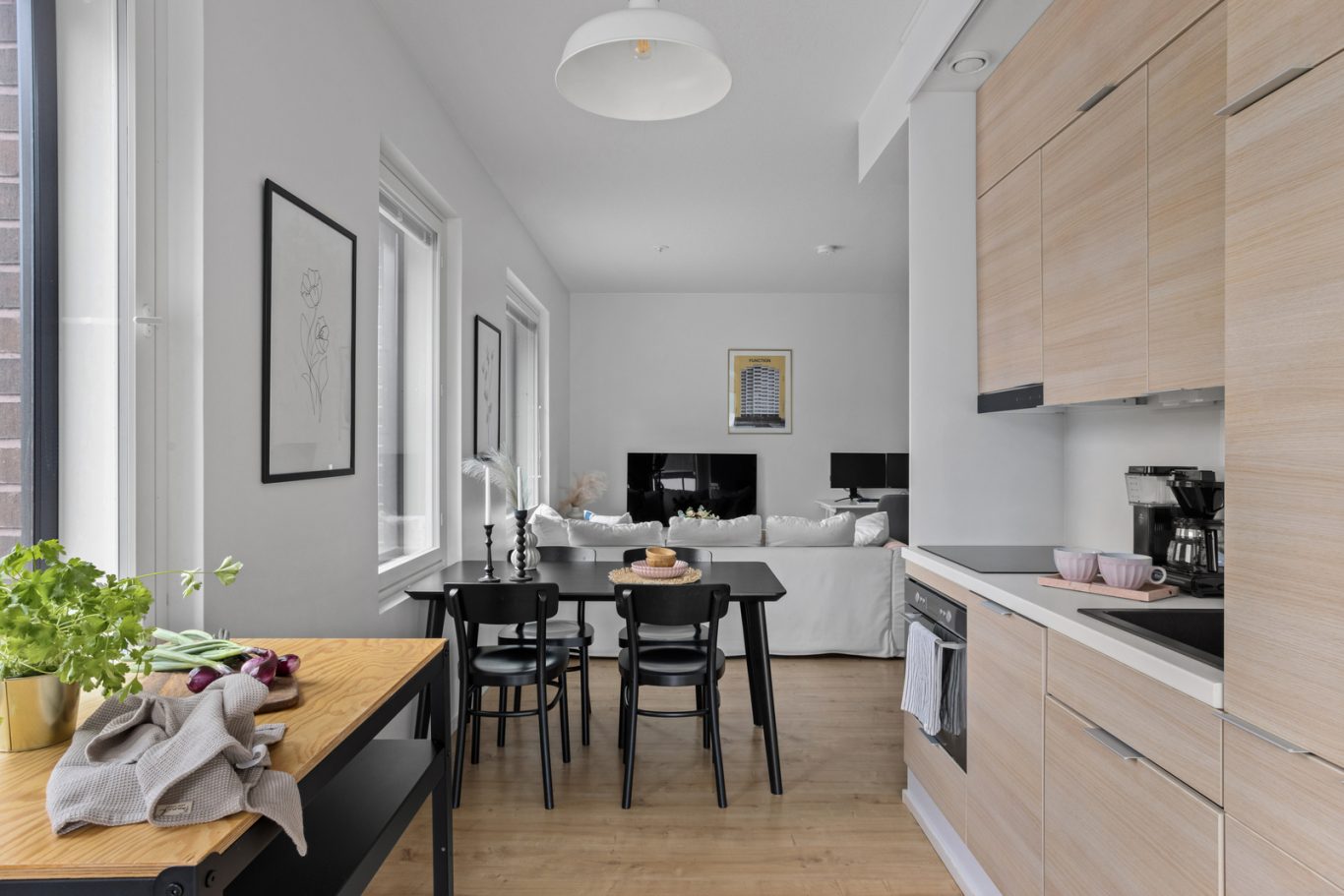 Trendikäs vaalea puunvärinen keittiö, jonka yhteyteen ikkunan ääreen mahtuu ruokapöytä.