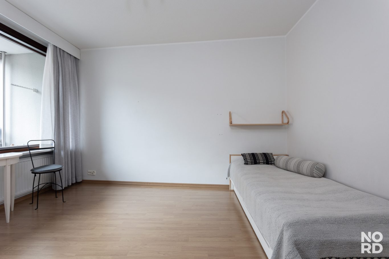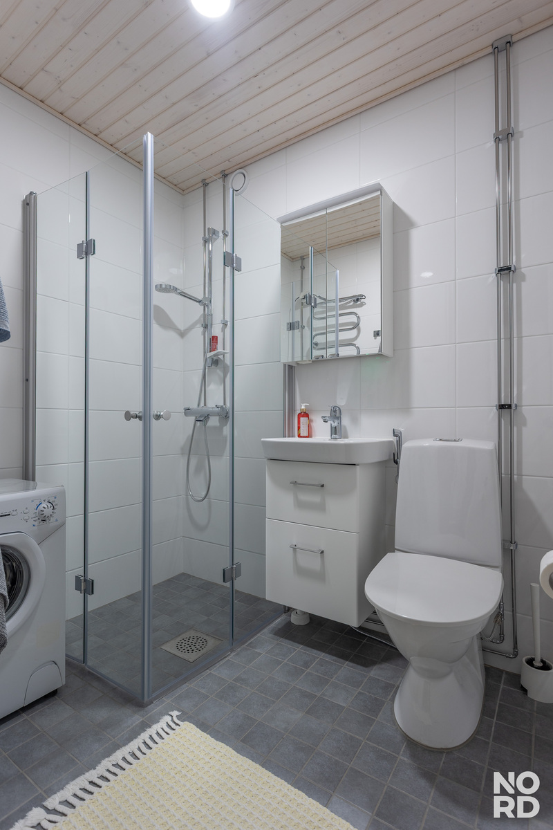 Huone on näppärän mallinen, johon mahtuu kaikki tarpeellinen. Keittokomero, jossa ikkuna ja kivasti kaappitilaa. Kylpyhuone on juuri remontoitu, kääntyvät suihkuseinät sekä hyvä paikka pesukoneelle. Pesukone kuuluu kauppaan.