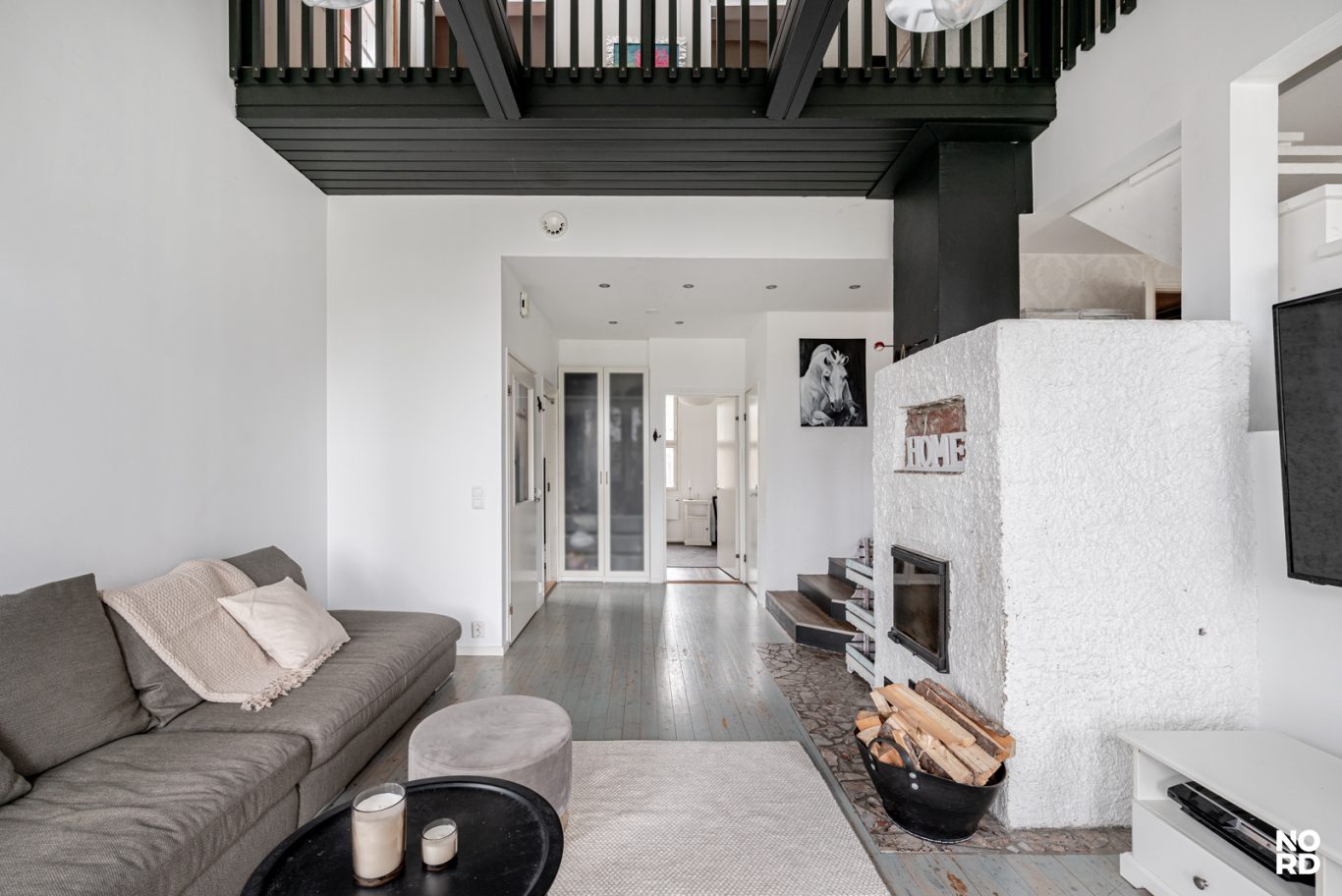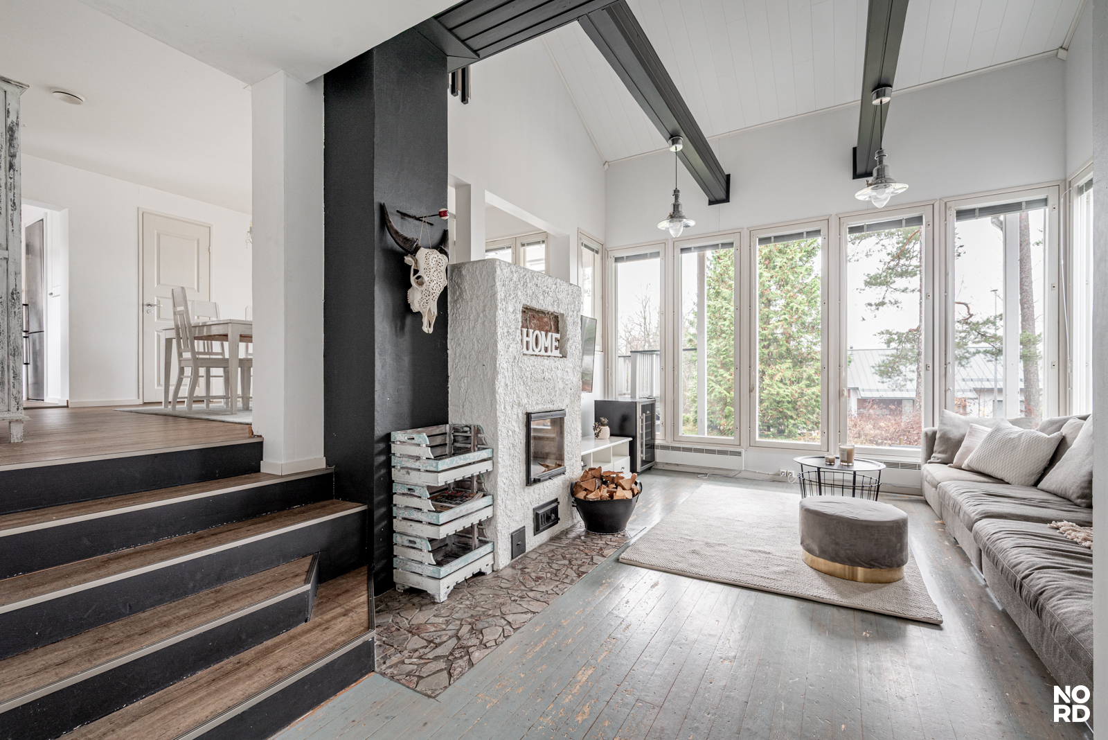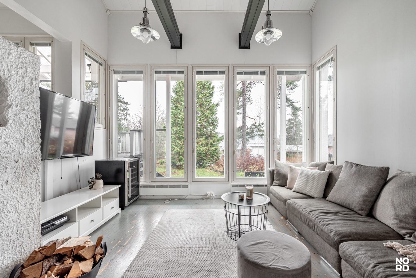 Olohuoneen lähes kuuden metrin huonekorkeus ja suuret ikkunat tekevät tilasta valoisan, ilmavan ja näyttävän.