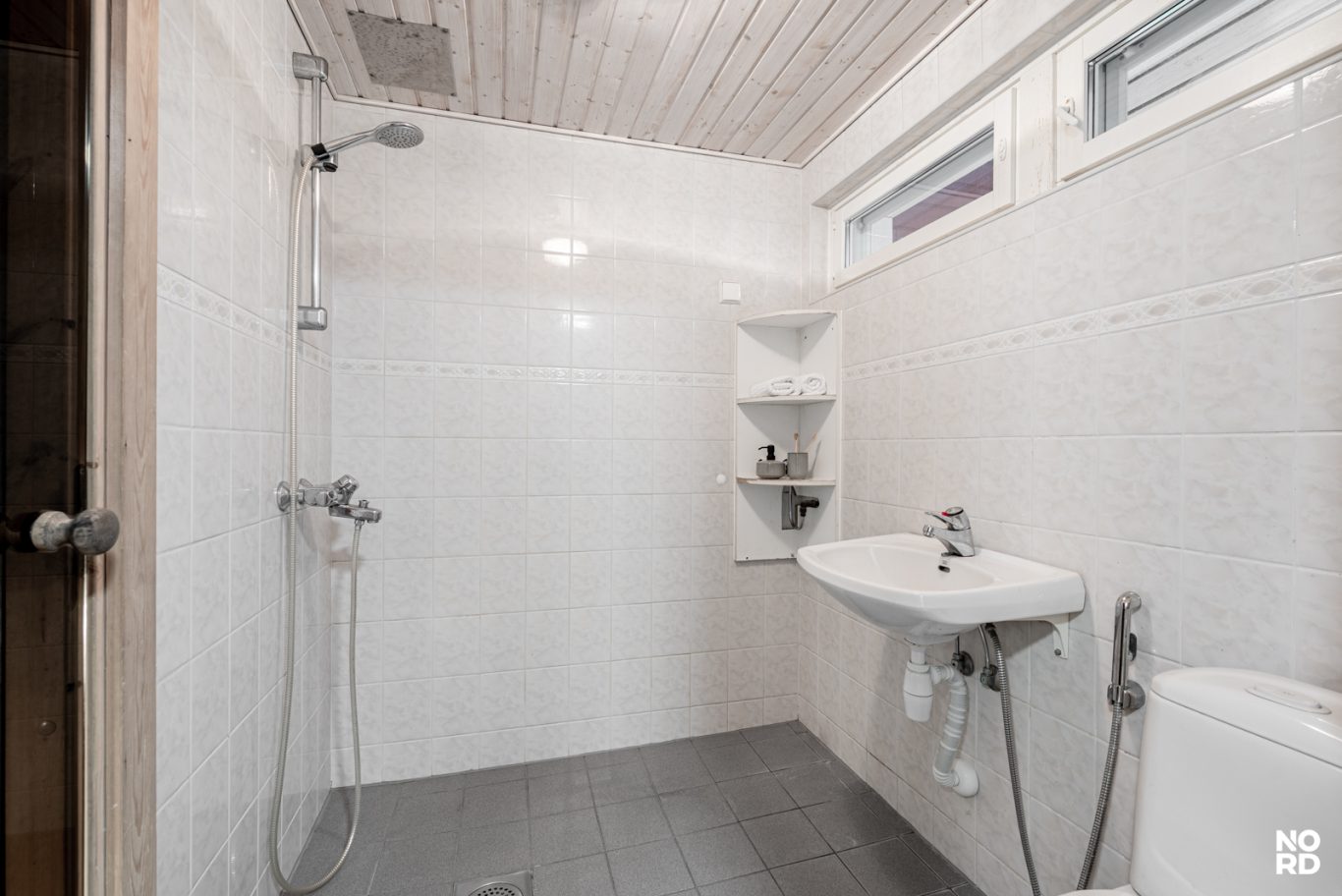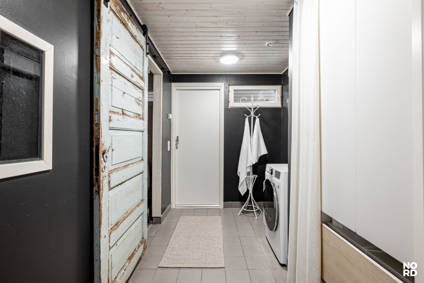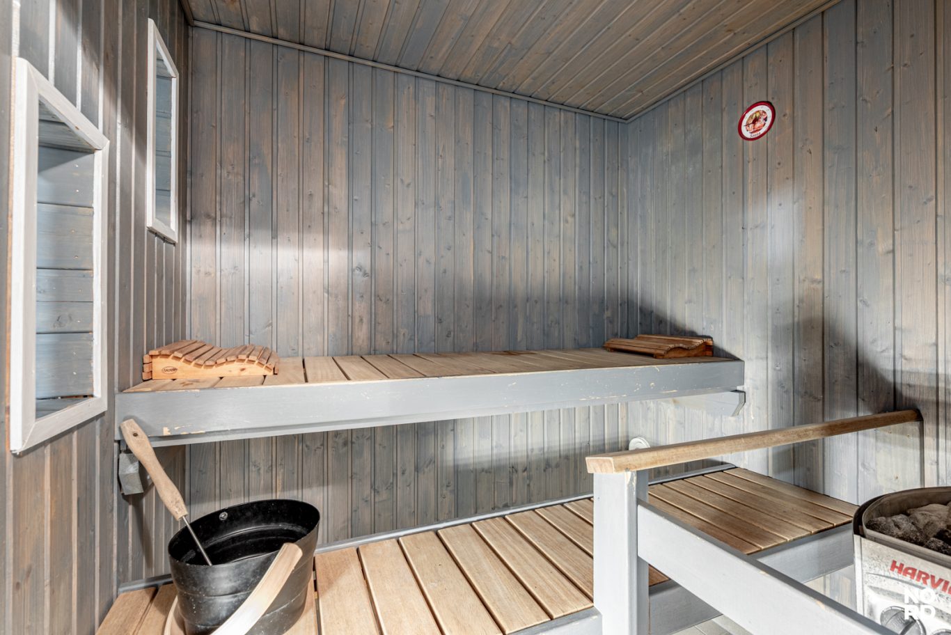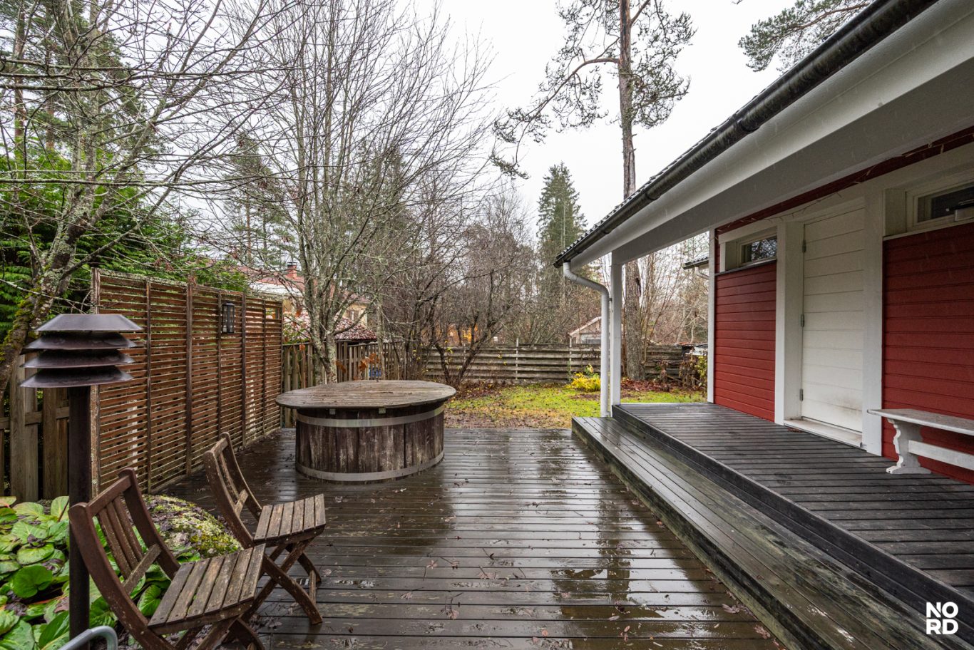Sauna, pesuhuone sekä arkea helpottava kodinhoitohuone ja erillinen wc. Saunatilasta on kätevästi käynti talon toiselle terassille, joka toimii hyvin saunan jälkeen vilvoitteluun.