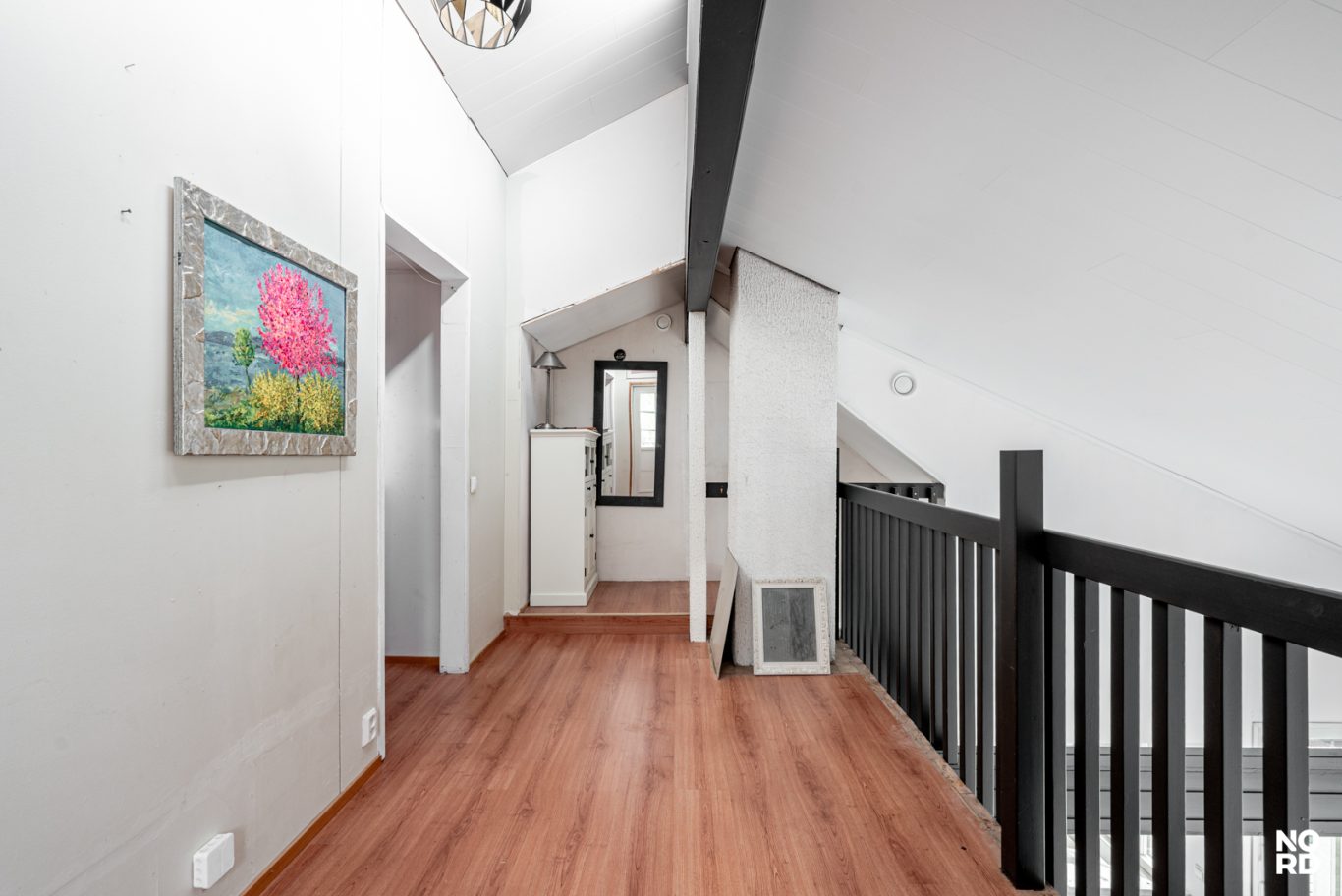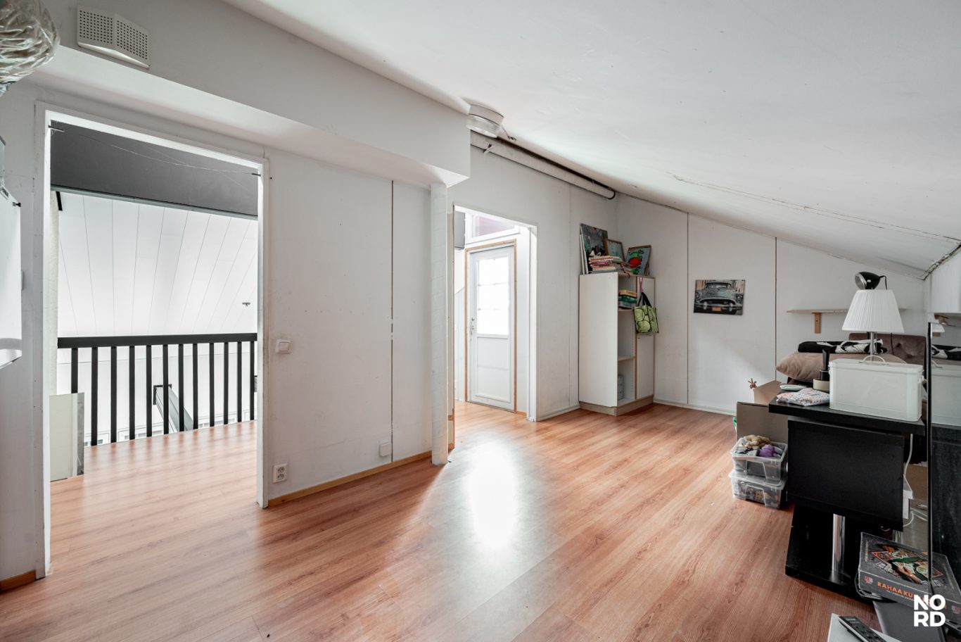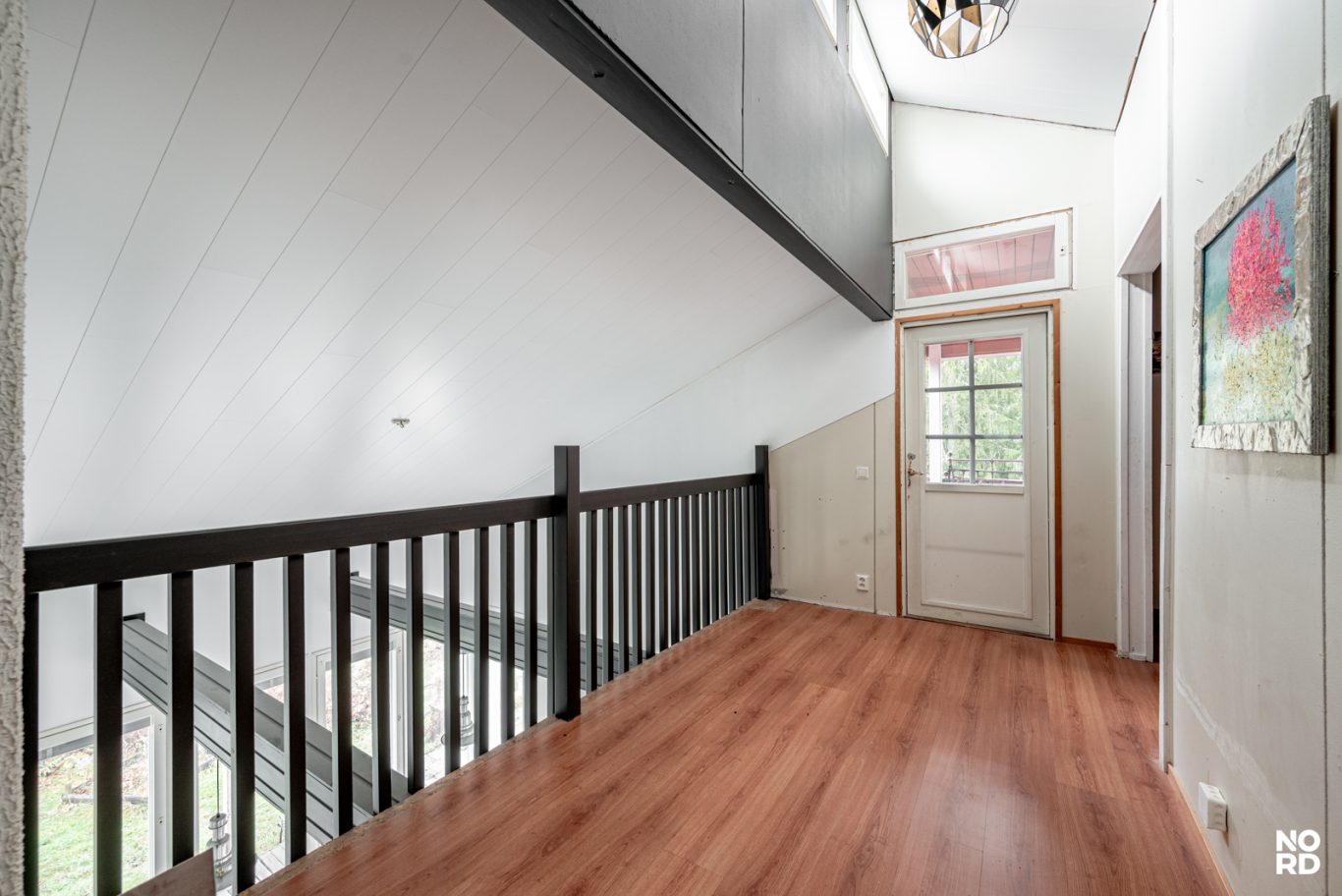 | Tilojen kuvaus | Ruokailutilasta on rappuset yläkertaan, jossa parvella kaksi tilaa, sekä käynti ullakolle. Parvelta käynti myös parvekkeelle. Tila on osittain viimeistelemätöntä, joka on moneen tapaan hyödynnettävissä. Voit tehdä sinne vaikka makuu- tai oleskelutiloja tai vaikkapa työhuoneen sekä säilytystiloja. Seinät maalattu ja lattia laminaatti. Vaatehuone päämakuuhuoneen vieressä. Tuulikaappi ja eteinen. |