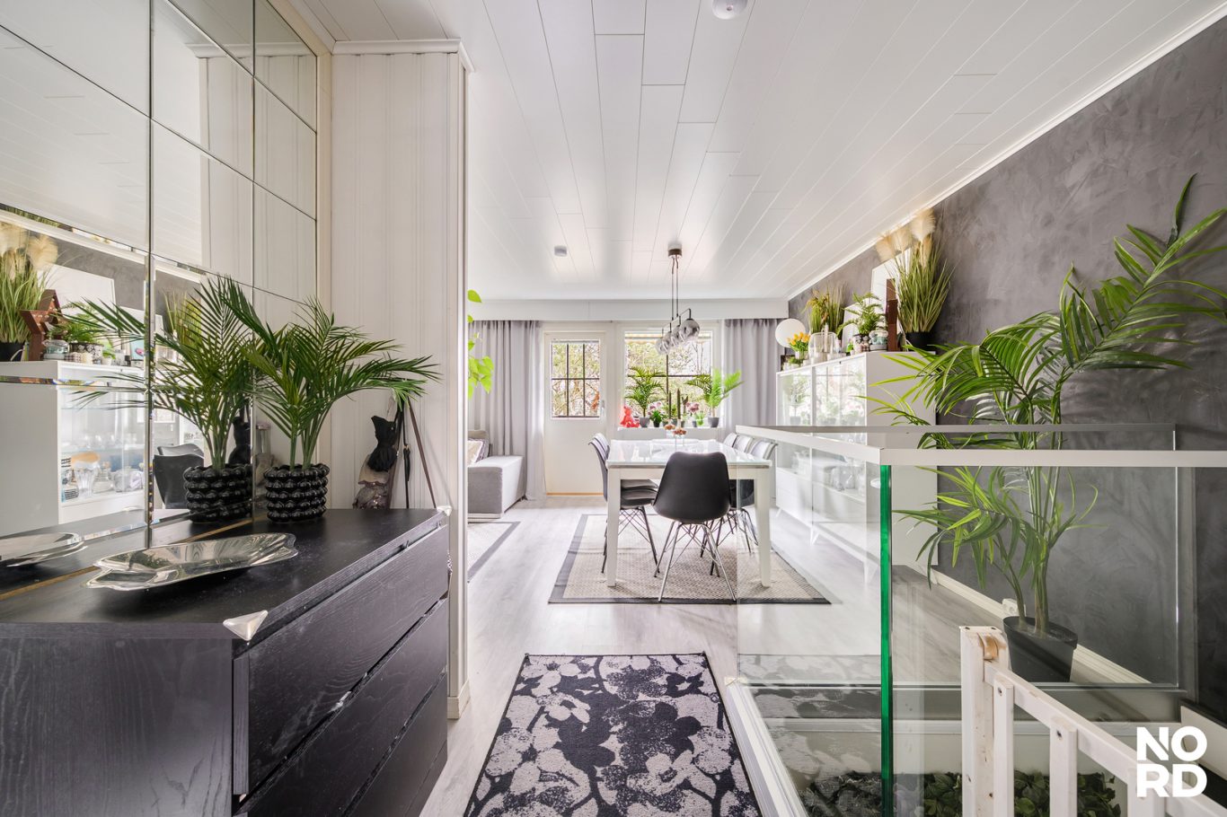 Myös edessä on oma piha, joka tekee sisäänkäynnistä erityisen viihtyisän. Asunnon pohjaratkaisu on käytännöllinen: alakerrassa makuuhuoneet ja yläkerrassa oleskelutilat sekä keittiö. Rappusten alle on rakennettu tilava vaatehuone, joka tuo runsaasti säilytystilaa arjen tarpeisiin.