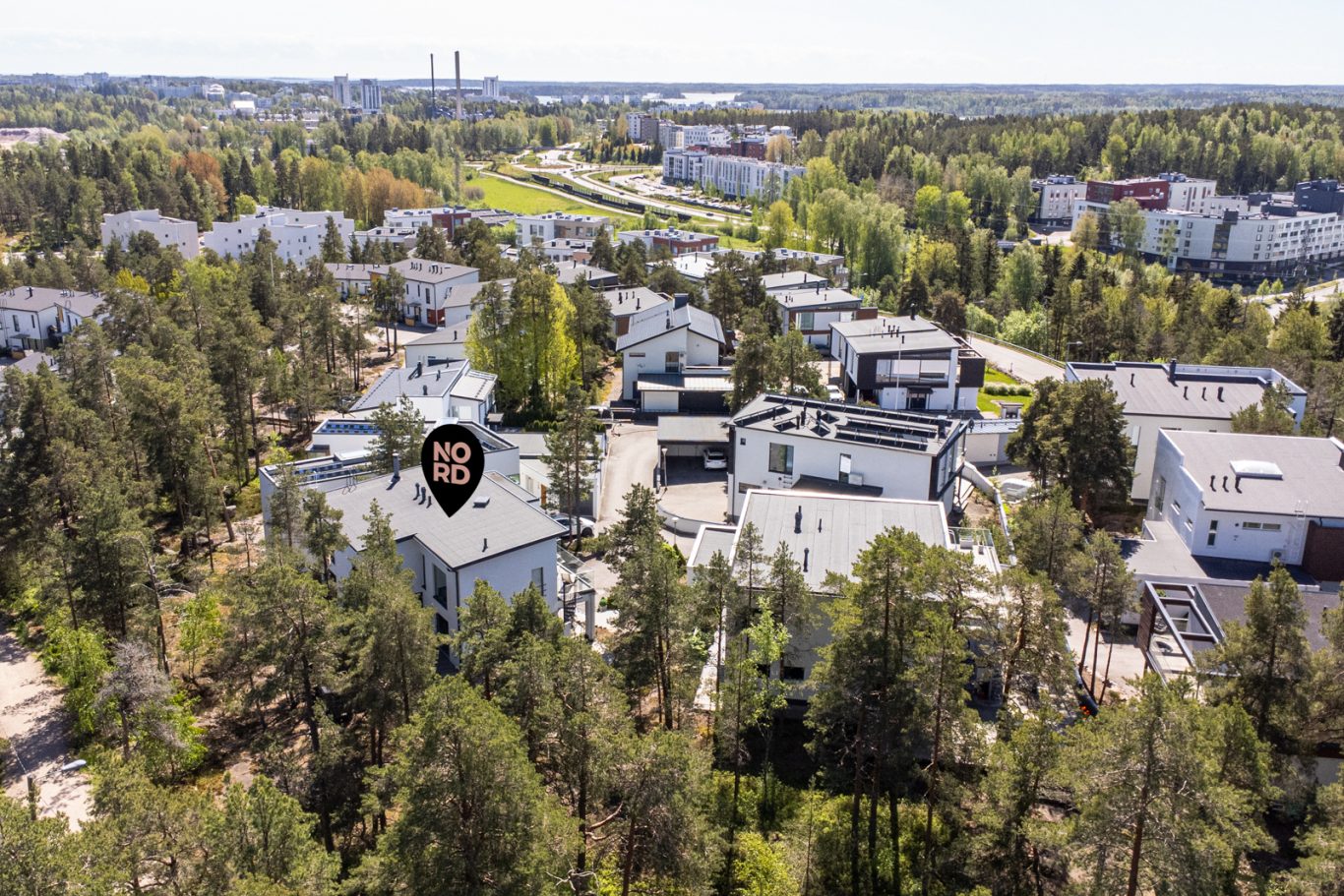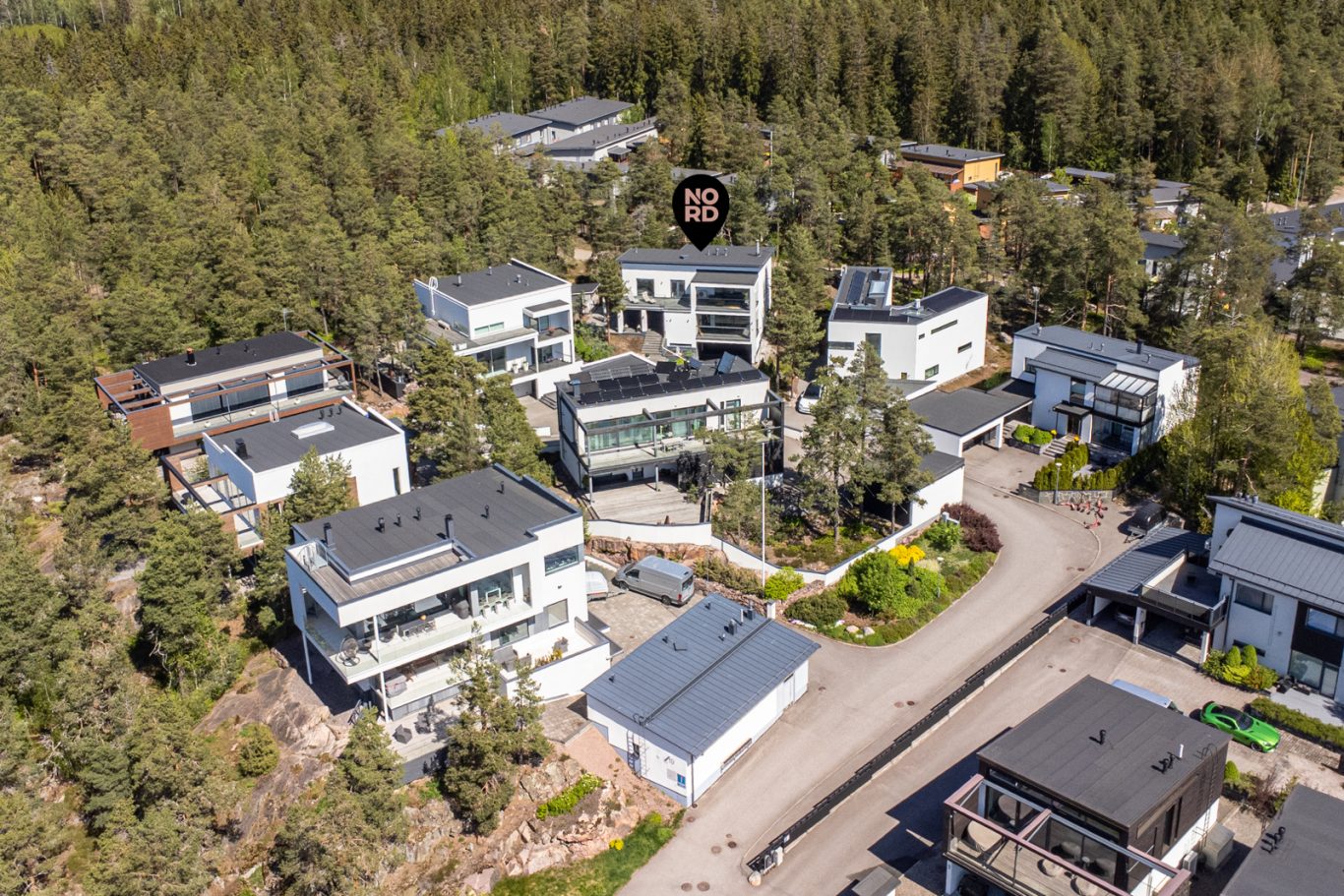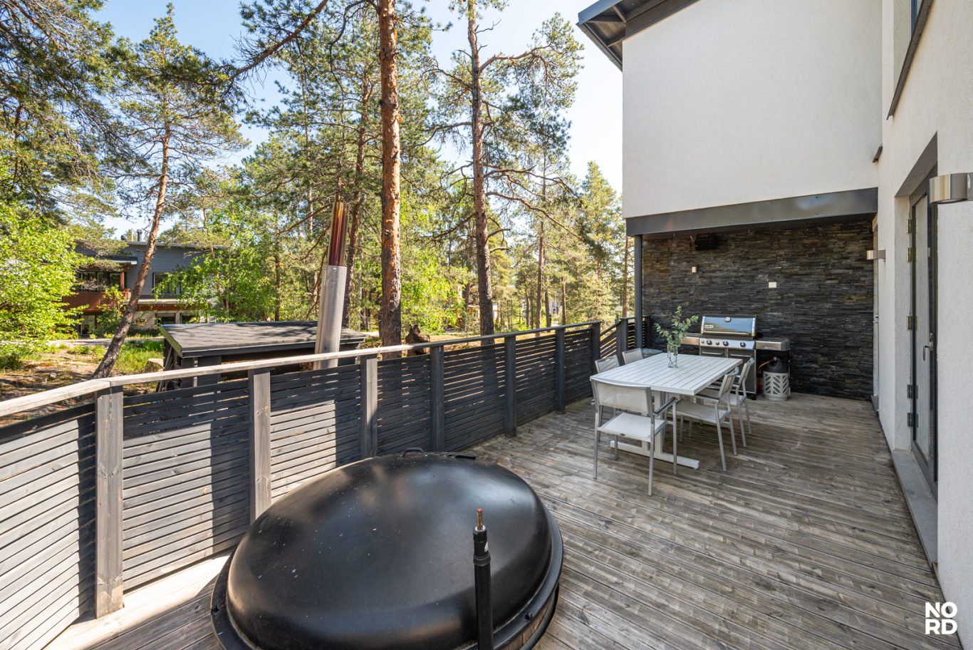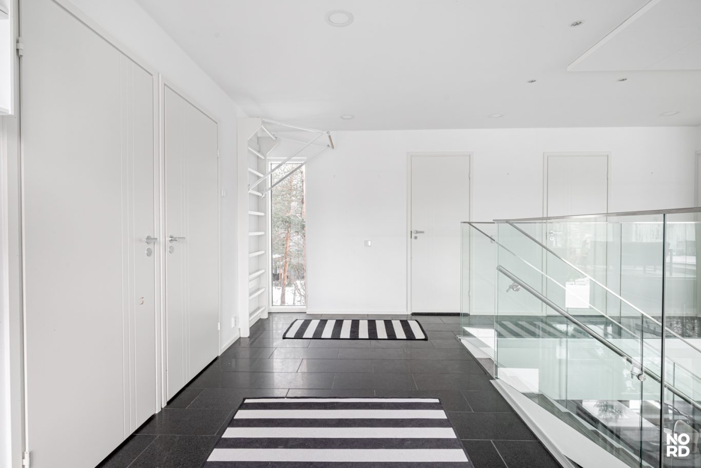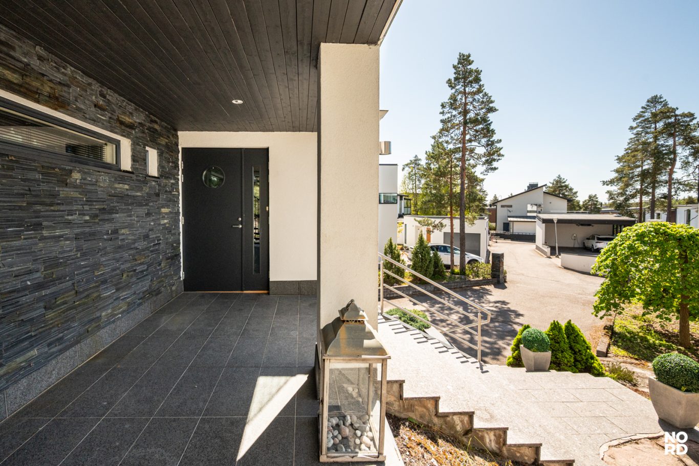 | Tilojen kuvaus | Yläkerrassa aulatila, josta käynti yläkerran osittain katetulle terassille. Aulatilan seinässä ilmalämpöpumppu. Seinät maalattu ja lattia laatta. Terassin toisesta päädystä on käynti kierreportaita pitkin pihan terassille. Keskikerroksessa eteinen, liukuovikaapisto, ja vaatehuone, jossa kura-allas. Seinät maalattu ja lattia laatta. Kellarikerroksessa normaali huonekorkeus; aulatila, jossa liukuovikaapisto, tekninentila/kodinhoitotila (pesukoneet), josta käynti myös autotalliin. Teknisessä tilassa maalämöpumppu, keskuspölyimurin keskusyksikkö, ilmanvaihtokone, ryhmäkeskus. Autotallin yhteydessä iso lämmin varasto. Pihaterassilla palju (puulämmitteinen), leikkimökki ja halkovaja. Talossa keskuspölyimuri ja Heos usean huoneen äänijärjestelmä sekä Bosch hälytysjärjestelmä. Autotallin katoksen alla latausasema seinässä (22 kw). |