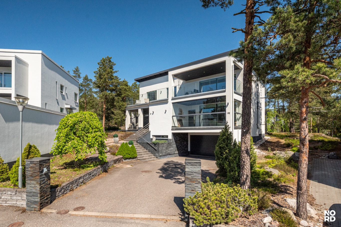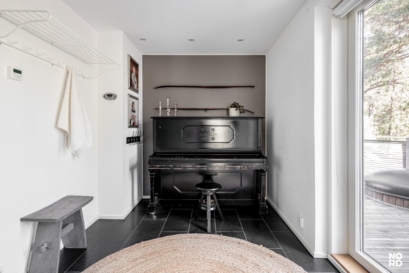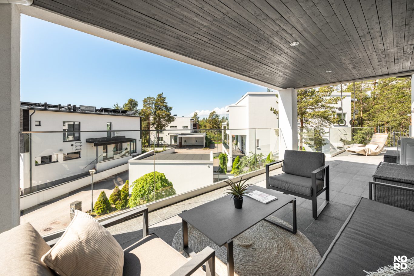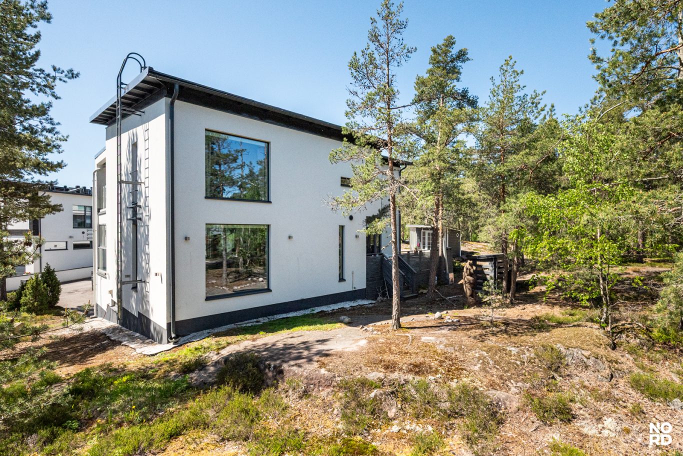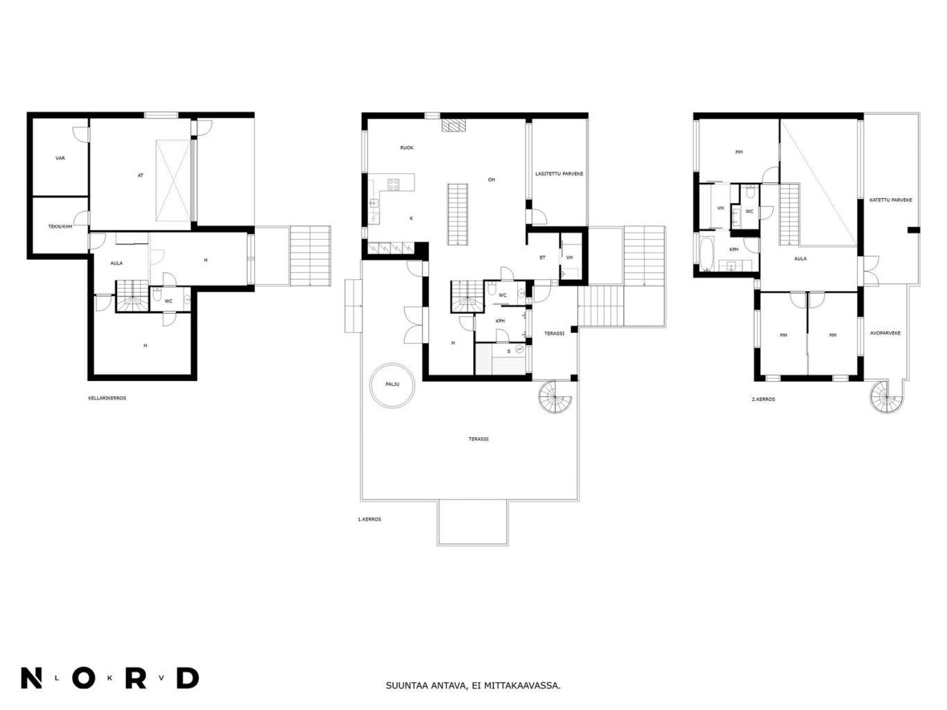 | Tilojen kuvaus | Yläkerrassa aulatila, josta käynti yläkerran osittain katetulle terassille. Aulatilan seinässä ilmalämpöpumppu. Seinät maalattu ja lattia laatta. Terassin toisesta päädystä on käynti kierreportaita pitkin pihan terassille. Keskikerroksessa eteinen, liukuovikaapisto, ja vaatehuone, jossa kura-allas. Seinät maalattu ja lattia laatta. Kellarikerroksessa normaali huonekorkeus; aulatila, jossa liukuovikaapisto, tekninentila/kodinhoitotila (pesukoneet), josta käynti myös autotalliin. Teknisessä tilassa maalämöpumppu, keskuspölyimurin keskusyksikkö, ilmanvaihtokone, ryhmäkeskus. Autotallin yhteydessä iso lämmin varasto. Pihaterassilla palju (puulämmitteinen), leikkimökki ja halkovaja. Talossa keskuspölyimuri ja Heos usean huoneen äänijärjestelmä sekä Bosch hälytysjärjestelmä. Autotallin katoksen alla latausasema seinässä (22 kw). |
