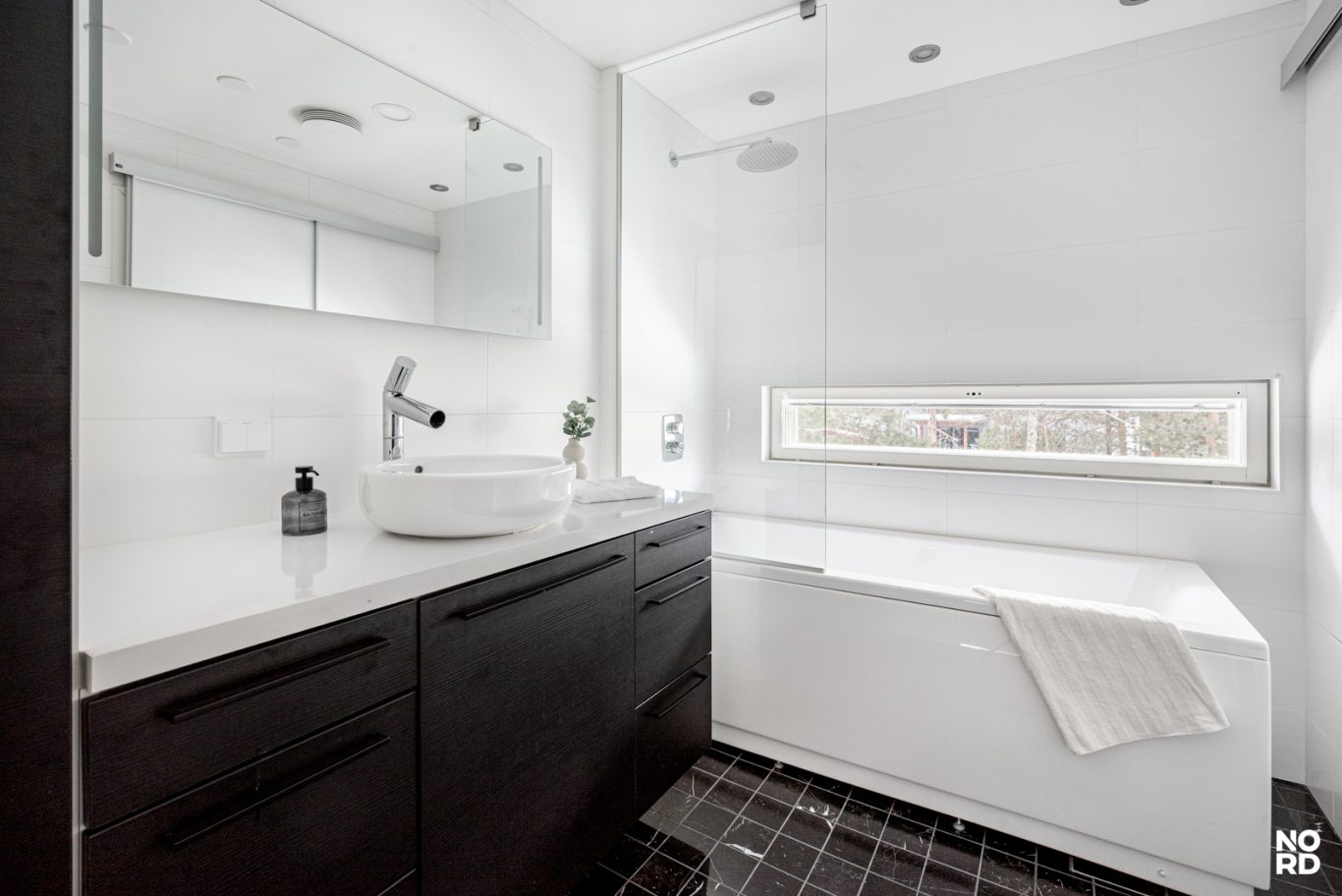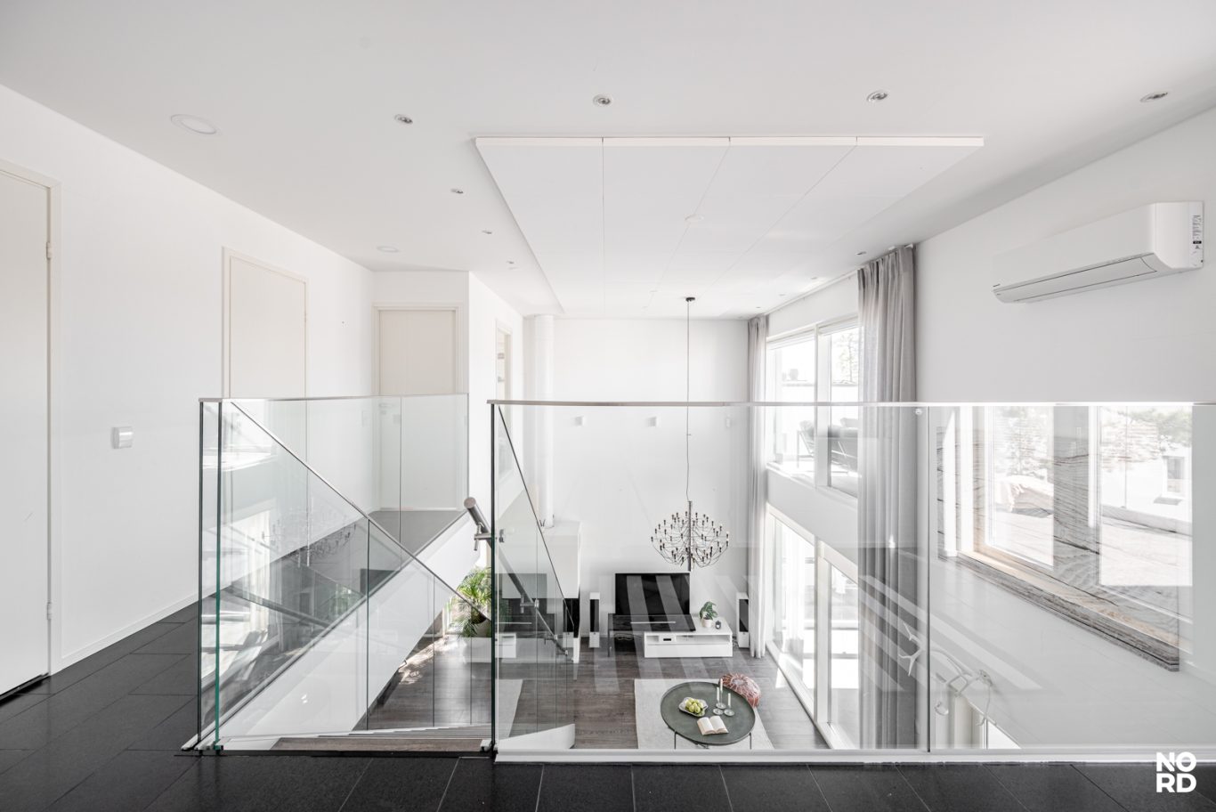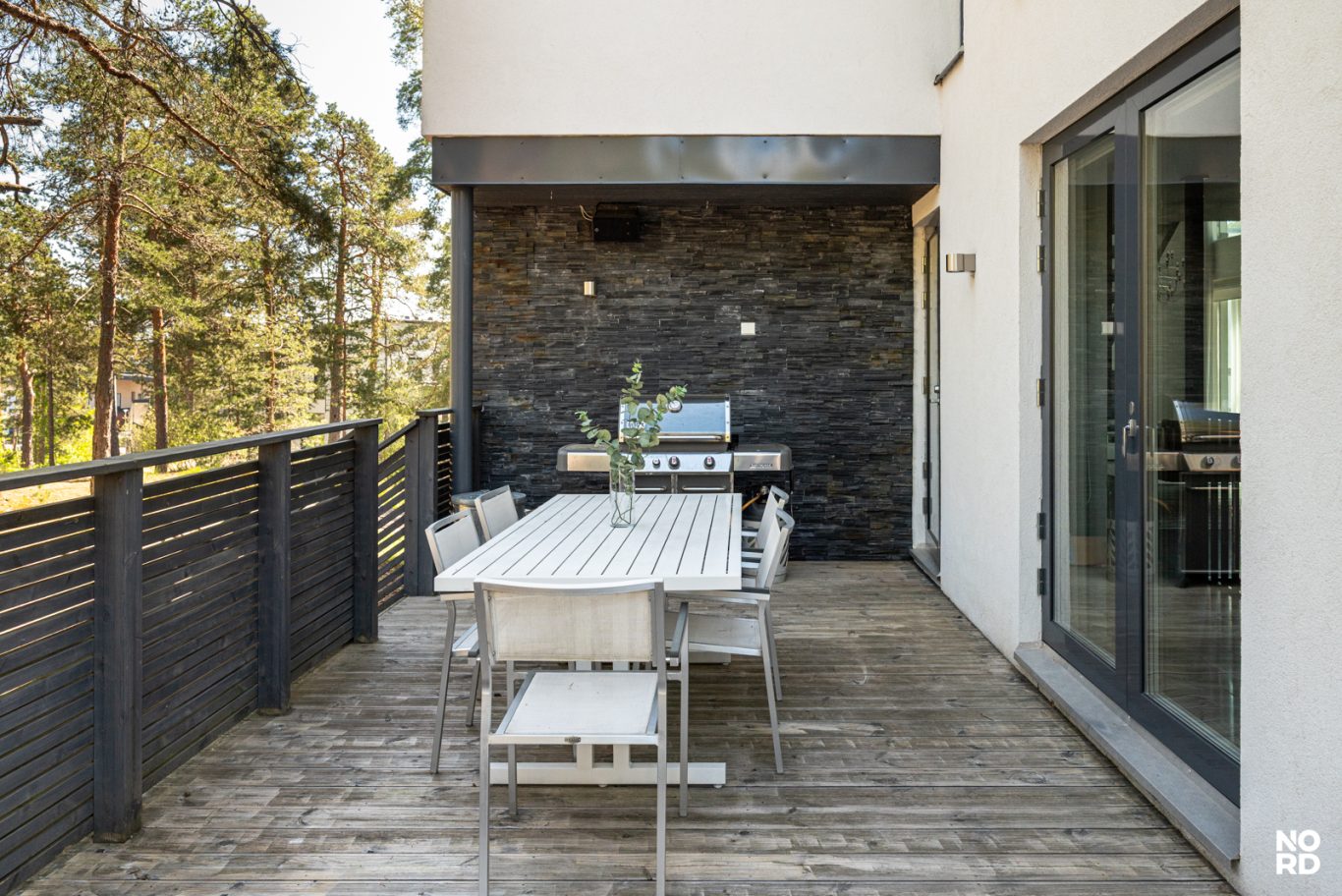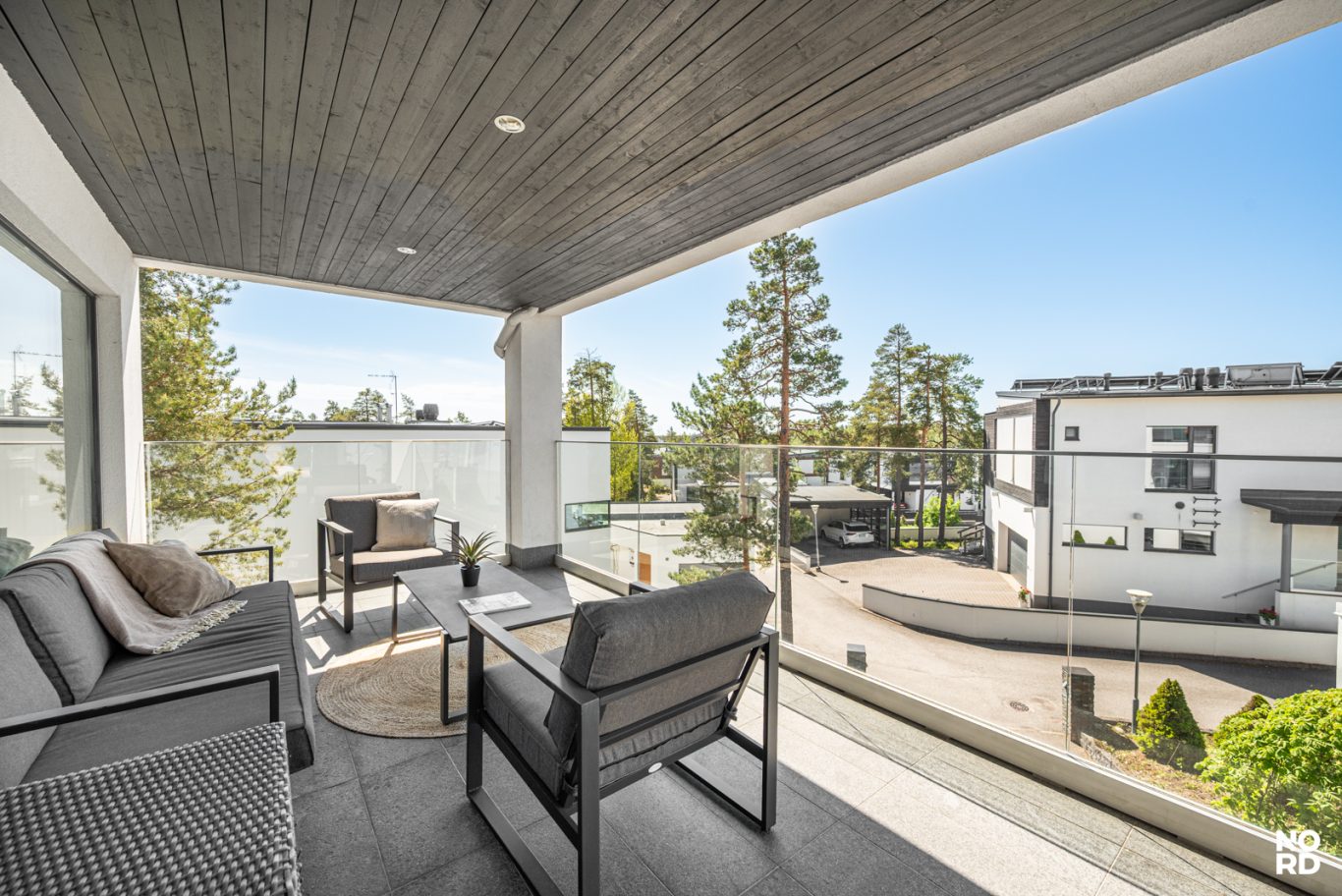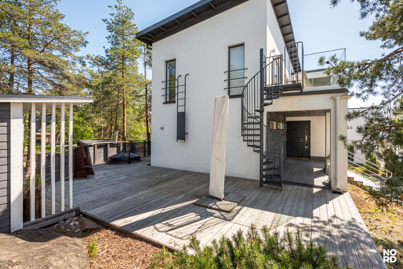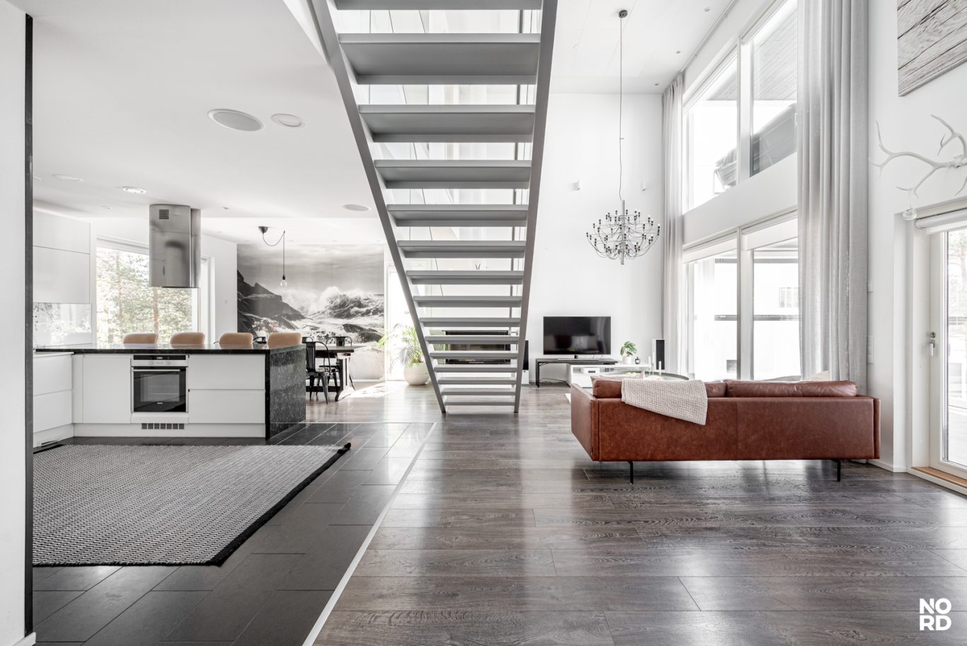 | Tilojen kuvaus | Yläkerrassa aulatila, josta käynti yläkerran osittain katetulle terassille. Aulatilan seinässä ilmalämpöpumppu. Seinät maalattu ja lattia laatta. Terassin toisesta päädystä on käynti kierreportaita pitkin pihan terassille. Keskikerroksessa eteinen, liukuovikaapisto, ja vaatehuone, jossa kura-allas. Seinät maalattu ja lattia laatta. Kellarikerroksessa normaali huonekorkeus; aulatila, jossa liukuovikaapisto, tekninentila/kodinhoitotila (pesukoneet), josta käynti myös autotalliin. Teknisessä tilassa maalämöpumppu, keskuspölyimurin keskusyksikkö, ilmanvaihtokone, ryhmäkeskus. Autotallin yhteydessä iso lämmin varasto. Pihaterassilla palju (puulämmitteinen), leikkimökki ja halkovaja. Talossa keskuspölyimuri ja Heos usean huoneen äänijärjestelmä sekä Bosch hälytysjärjestelmä. Autotallin katoksen alla latausasema seinässä (22 kw). |