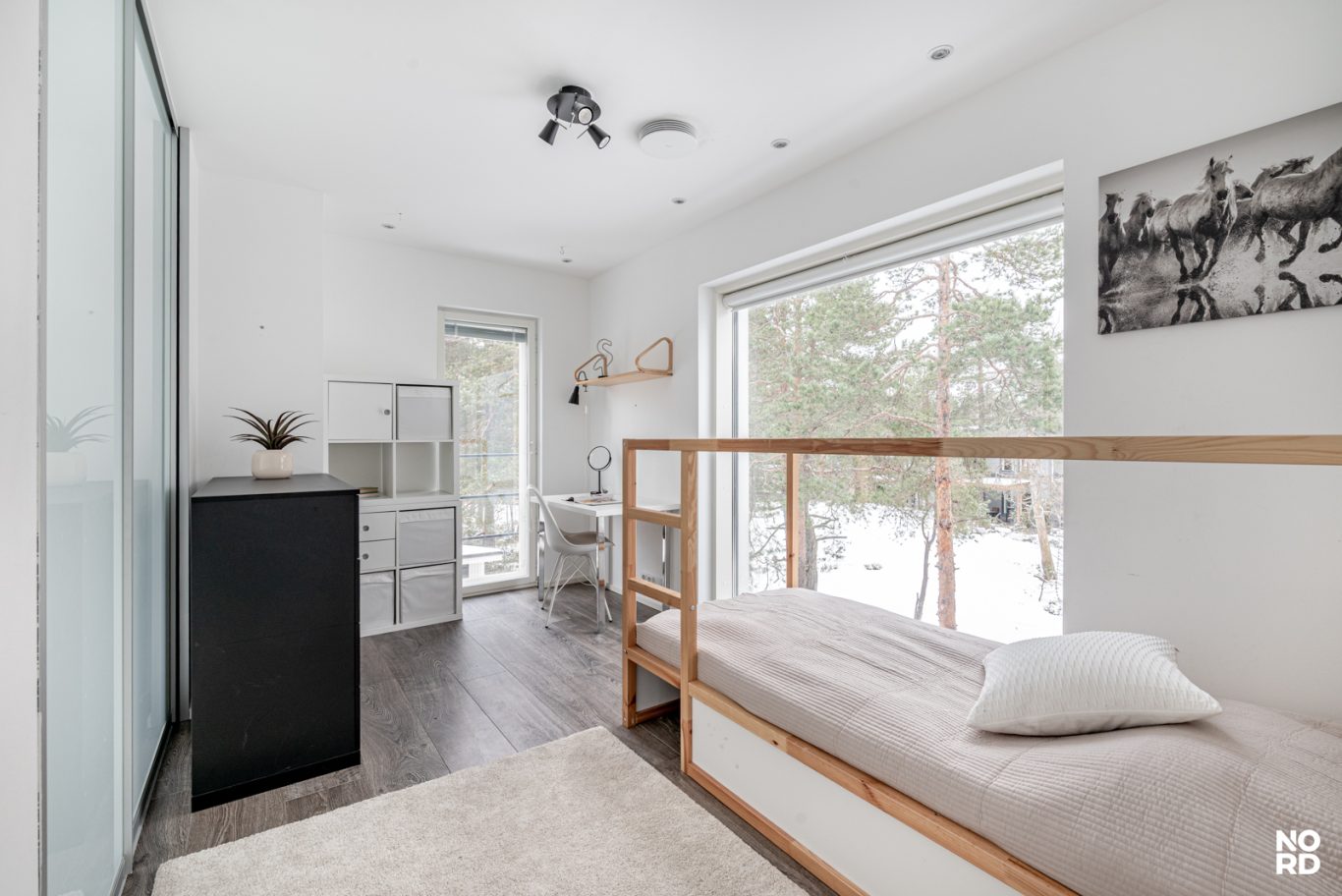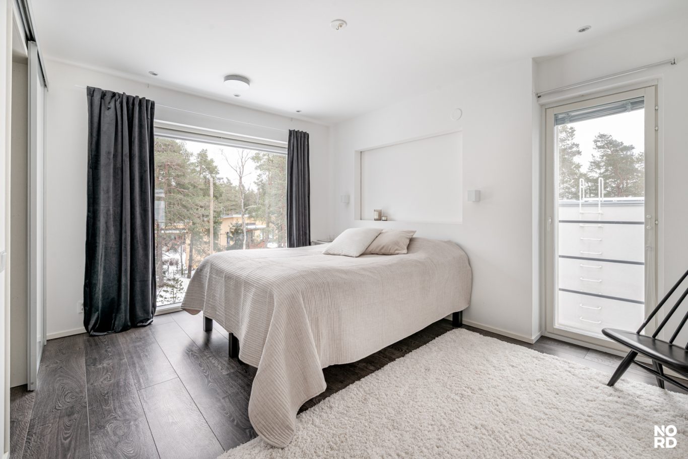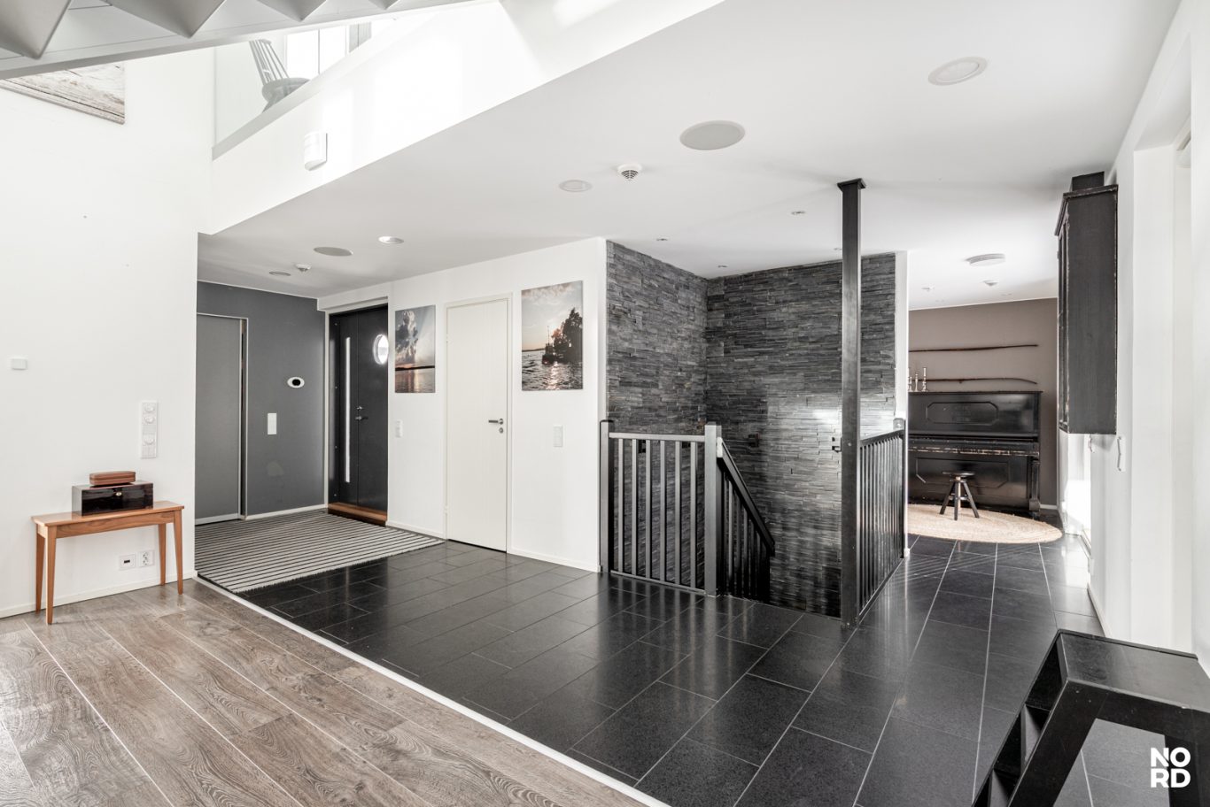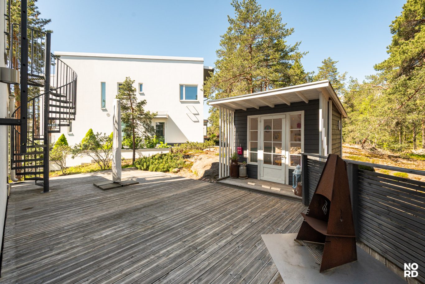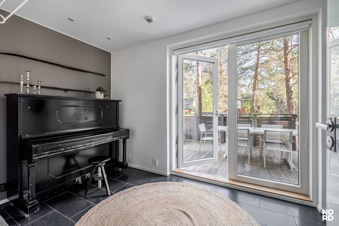 | Tilojen kuvaus | Yläkerrassa aulatila, josta käynti yläkerran osittain katetulle terassille. Aulatilan seinässä ilmalämpöpumppu. Seinät maalattu ja lattia laatta. Terassin toisesta päädystä on käynti kierreportaita pitkin pihan terassille. Keskikerroksessa eteinen, liukuovikaapisto, ja vaatehuone, jossa kura-allas. Seinät maalattu ja lattia laatta. Kellarikerroksessa normaali huonekorkeus; aulatila, jossa liukuovikaapisto, tekninentila/kodinhoitotila (pesukoneet), josta käynti myös autotalliin. Teknisessä tilassa maalämöpumppu, keskuspölyimurin keskusyksikkö, ilmanvaihtokone, ryhmäkeskus. Autotallin yhteydessä iso lämmin varasto. Pihaterassilla palju (puulämmitteinen), leikkimökki ja halkovaja. Talossa keskuspölyimuri ja Heos usean huoneen äänijärjestelmä sekä Bosch hälytysjärjestelmä. Autotallin katoksen alla latausasema seinässä (22 kw). |