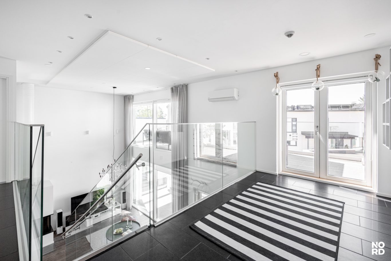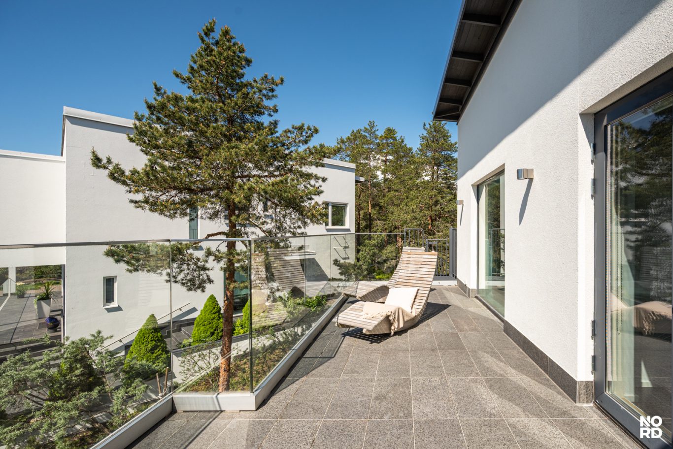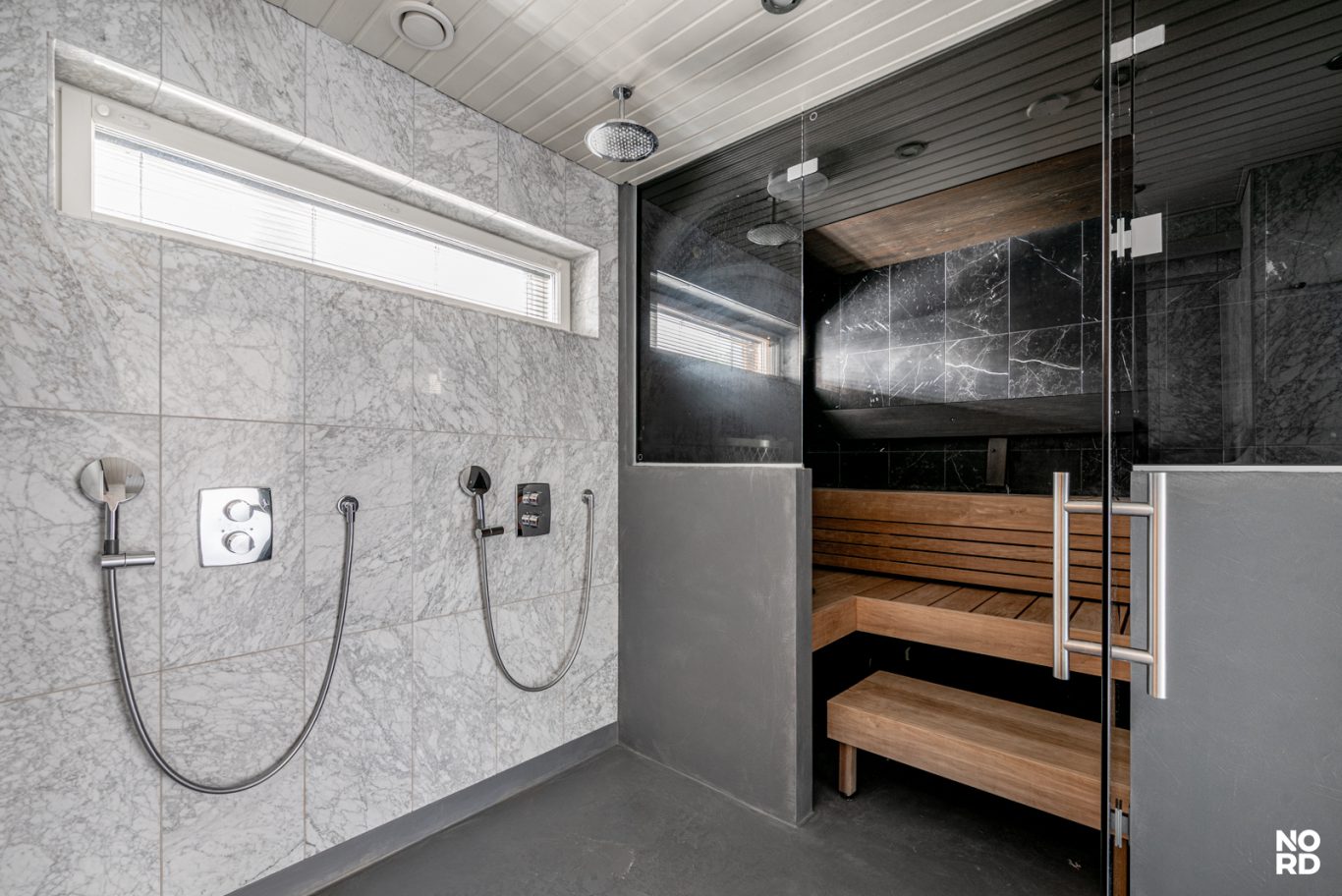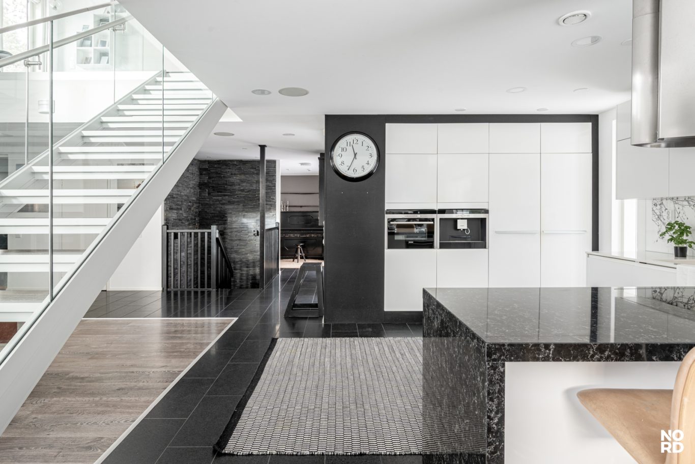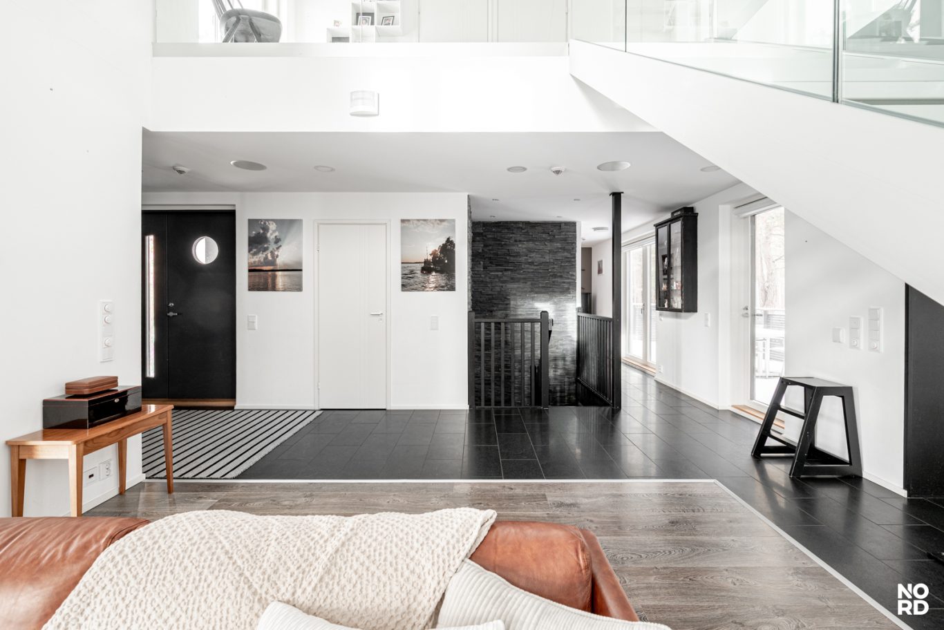 | Tilojen kuvaus | Yläkerrassa aulatila, josta käynti yläkerran osittain katetulle terassille. Aulatilan seinässä ilmalämpöpumppu. Seinät maalattu ja lattia laatta. Terassin toisesta päädystä on käynti kierreportaita pitkin pihan terassille. Keskikerroksessa eteinen, liukuovikaapisto, ja vaatehuone, jossa kura-allas. Seinät maalattu ja lattia laatta. Kellarikerroksessa normaali huonekorkeus; aulatila, jossa liukuovikaapisto, tekninentila/kodinhoitotila (pesukoneet), josta käynti myös autotalliin. Teknisessä tilassa maalämöpumppu, keskuspölyimurin keskusyksikkö, ilmanvaihtokone, ryhmäkeskus. Autotallin yhteydessä iso lämmin varasto. Pihaterassilla palju (puulämmitteinen), leikkimökki ja halkovaja. Talossa keskuspölyimuri ja Heos usean huoneen äänijärjestelmä sekä Bosch hälytysjärjestelmä. Autotallin katoksen alla latausasema seinässä (22 kw). |