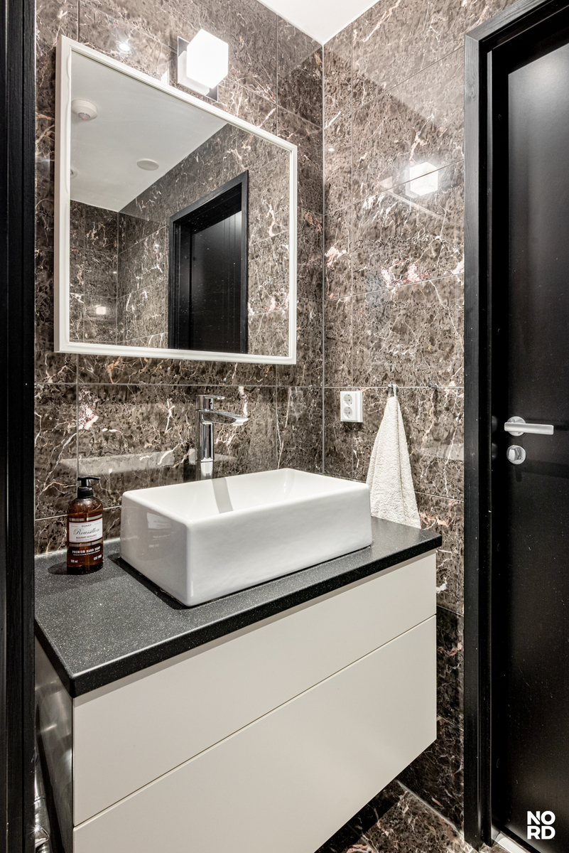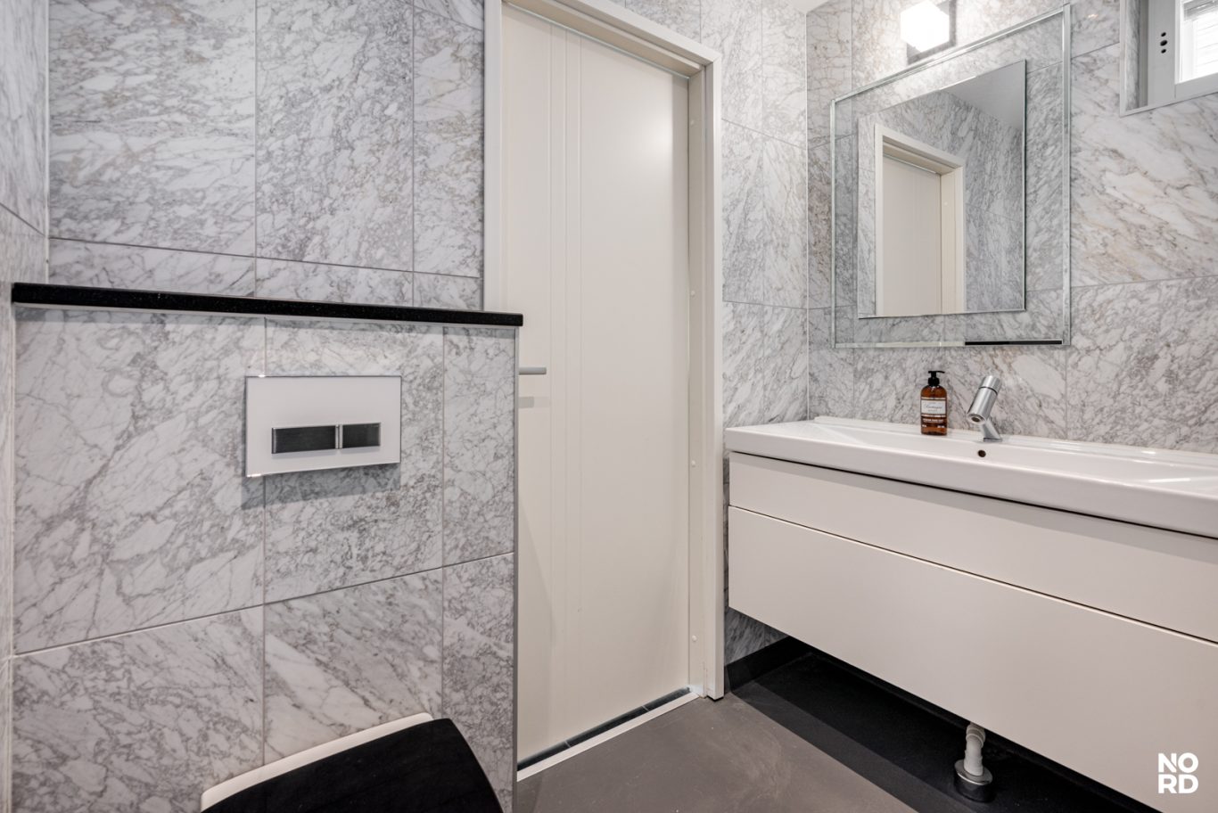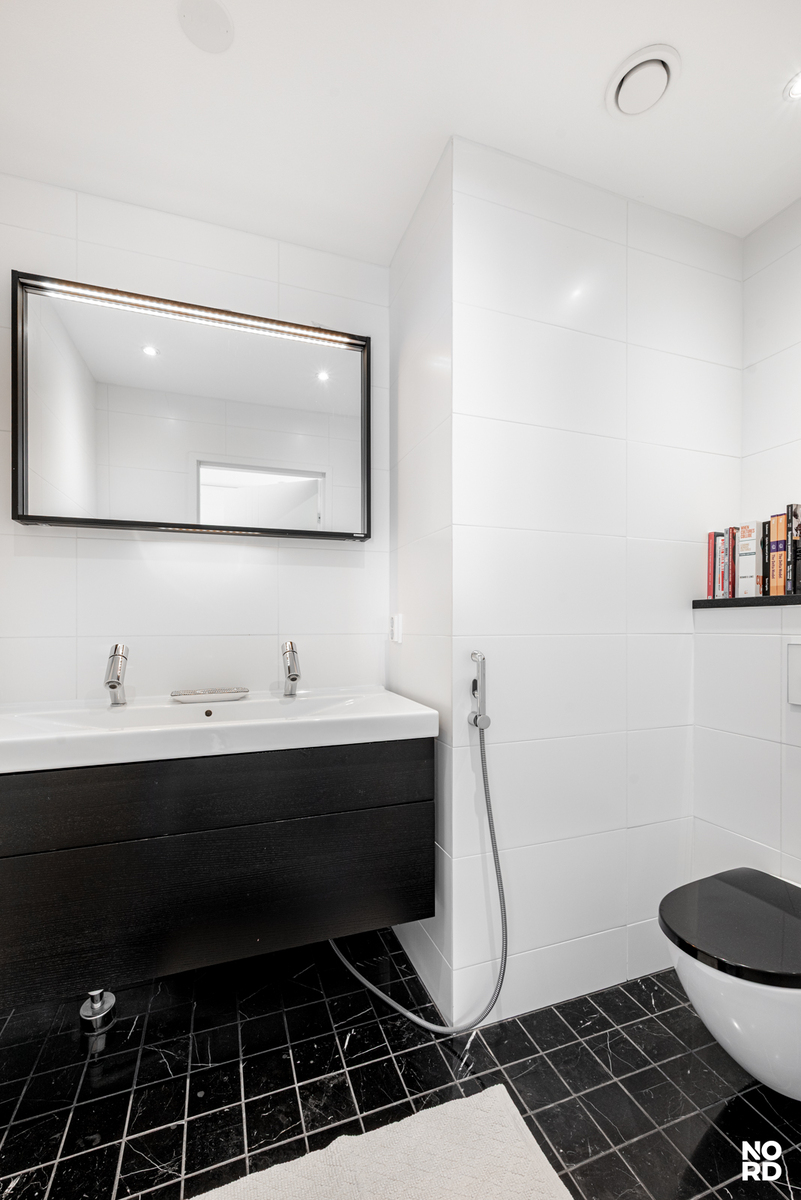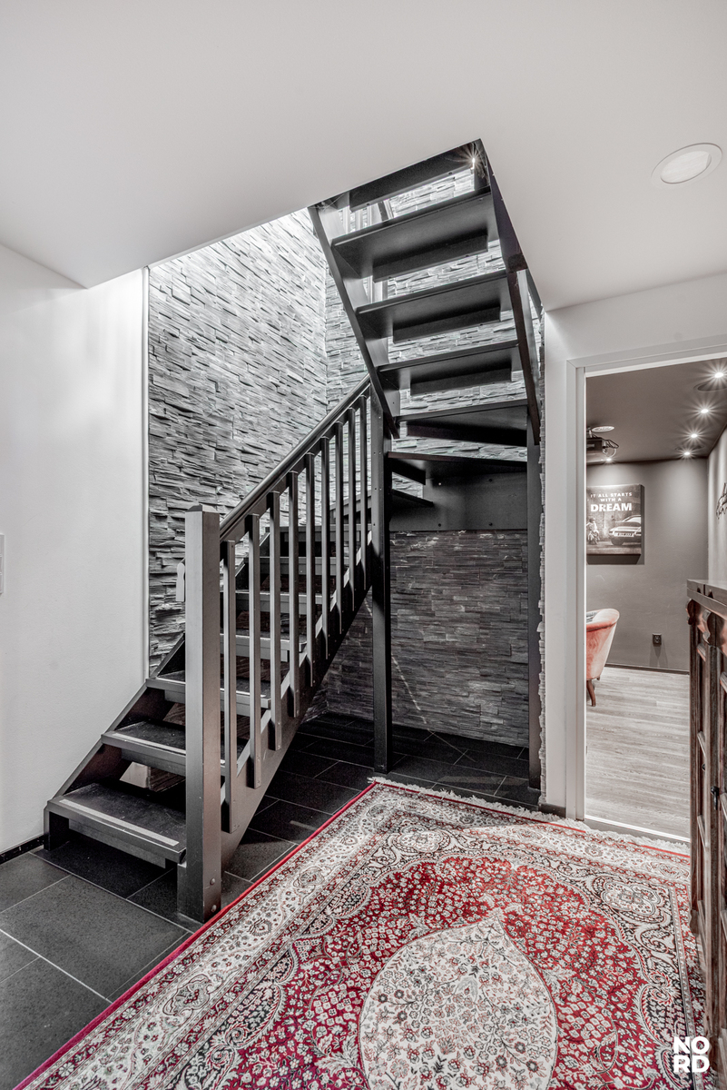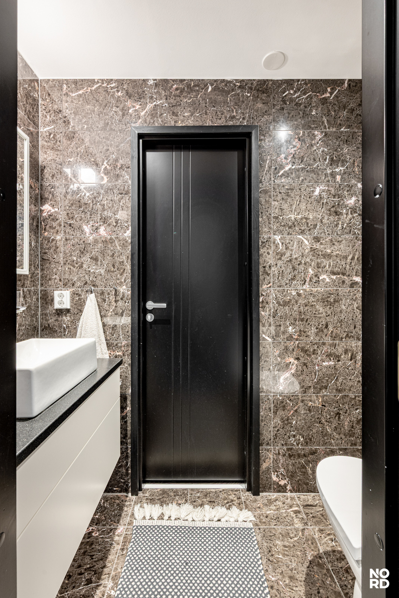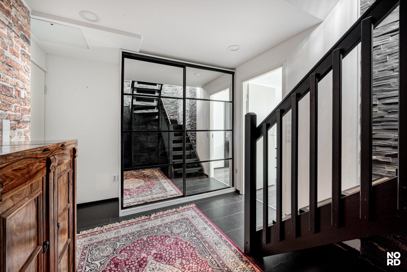 | Tilojen kuvaus | Yläkerrassa aulatila, josta käynti yläkerran osittain katetulle terassille. Aulatilan seinässä ilmalämpöpumppu. Seinät maalattu ja lattia laatta. Terassin toisesta päädystä on käynti kierreportaita pitkin pihan terassille. Keskikerroksessa eteinen, liukuovikaapisto, ja vaatehuone, jossa kura-allas. Seinät maalattu ja lattia laatta. Kellarikerroksessa normaali huonekorkeus; aulatila, jossa liukuovikaapisto, tekninentila/kodinhoitotila (pesukoneet), josta käynti myös autotalliin. Teknisessä tilassa maalämöpumppu, keskuspölyimurin keskusyksikkö, ilmanvaihtokone, ryhmäkeskus. Autotallin yhteydessä iso lämmin varasto. Pihaterassilla palju (puulämmitteinen), leikkimökki ja halkovaja. Talossa keskuspölyimuri ja Heos usean huoneen äänijärjestelmä sekä Bosch hälytysjärjestelmä. Autotallin katoksen alla latausasema seinässä (22 kw). |