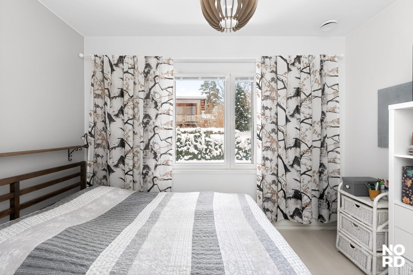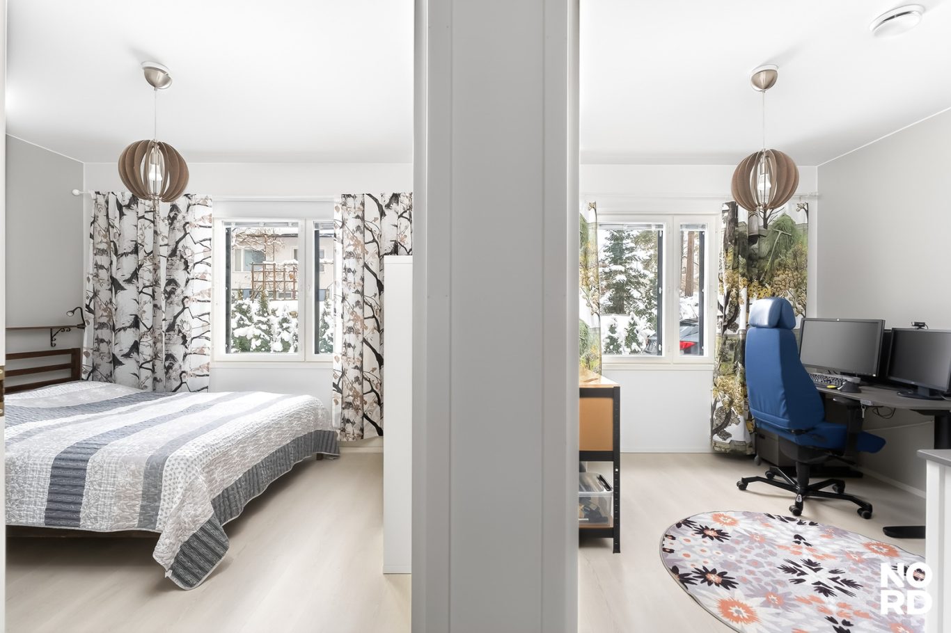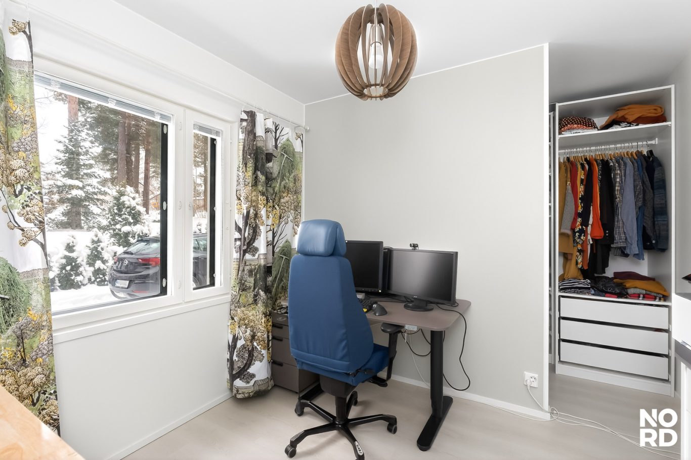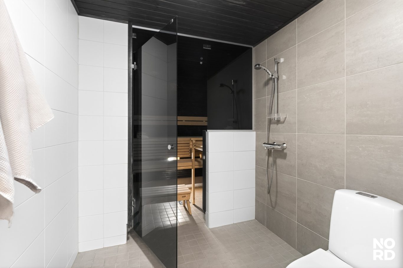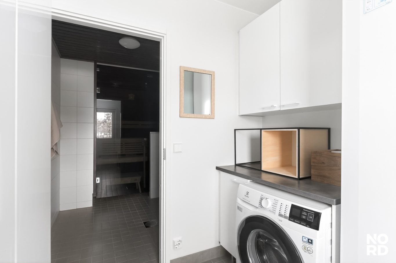 Helppo 1-tasoratkaisu, 2 makuuhuonetta, toisessa ns walking closet vaatehuone, moderni avoin keittiö olohuoneratkaisu, olohuoneessa takkavaraus, erillinen wc löytyy ja tietysti oma sauna, kylpyhuone ja kodinhoitotilat.
