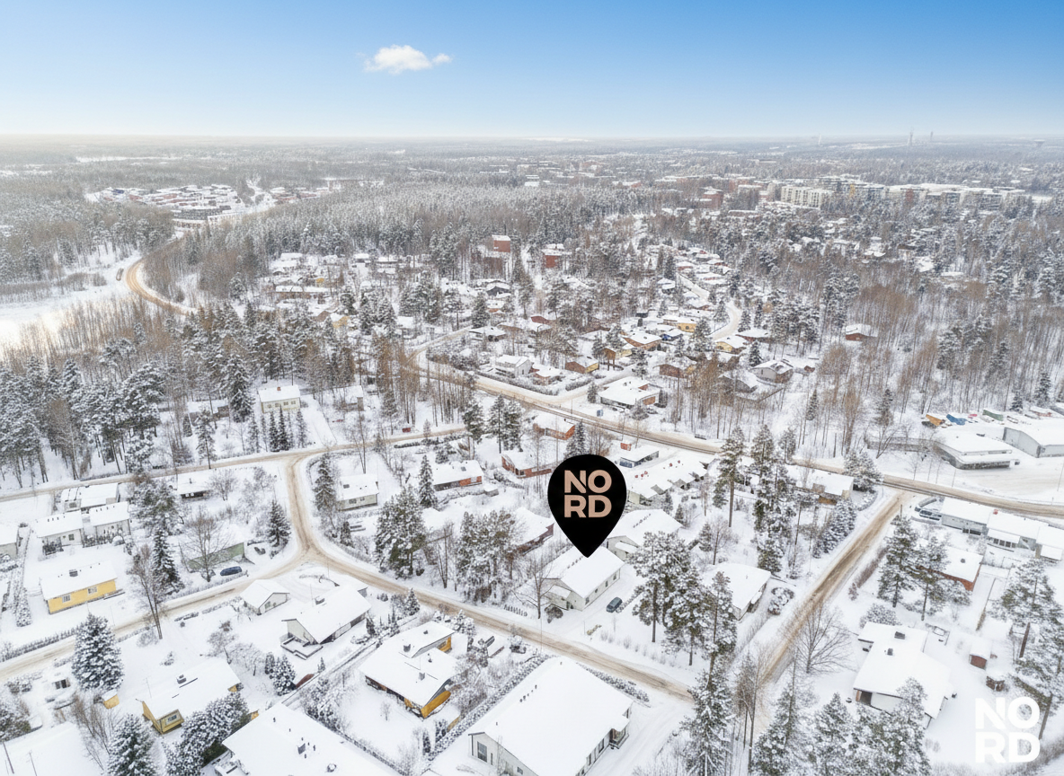 Palvelut Vantaan ja Espoon puolella muutaman kilometrin päässä, hyvät julkiset yhteydet, bussipysäkki lähin n 50m ja 250m metrin päästä bussilla yhteys juna-asemalle Espoon Leppävaaraan tai Vantaan Myyrmäkeen.