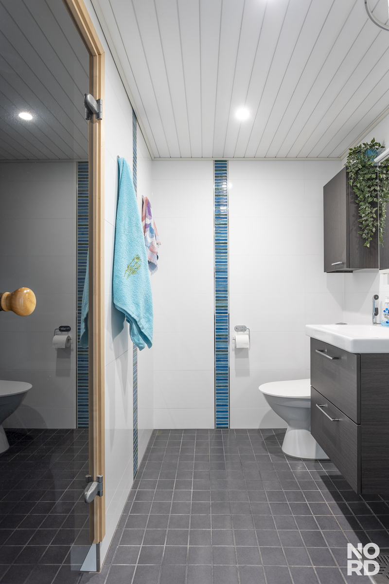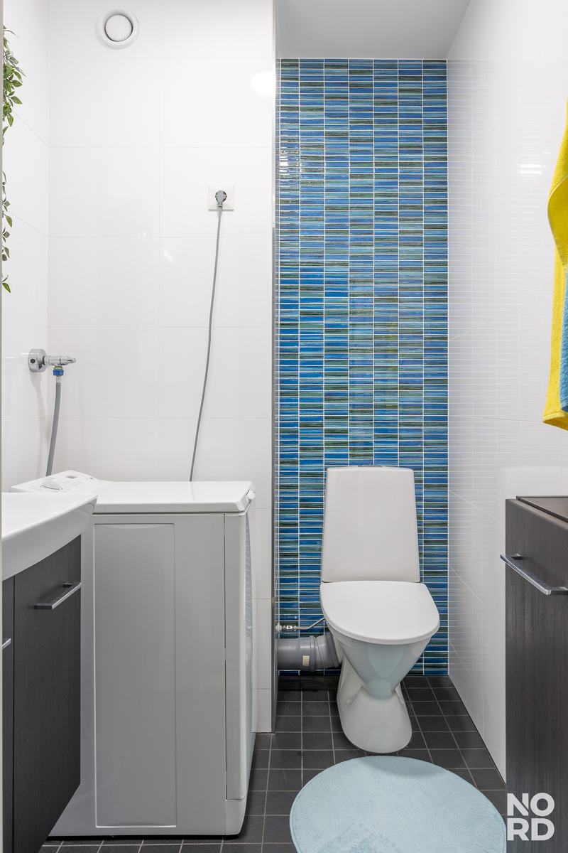 Oma sauna toimii tällä hetkellä hyvänä varastona, mutta on helposti muutettavissa takaisin saunaksi. Erillinen wc sekä vuonna 2016 remontoidut pesutilat tukevat perheen arjen toimivuutta. Taloyhtiössä on myös uima-allas, joka on erityisesti lasten mieleen.