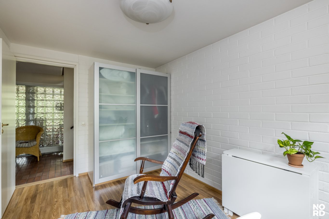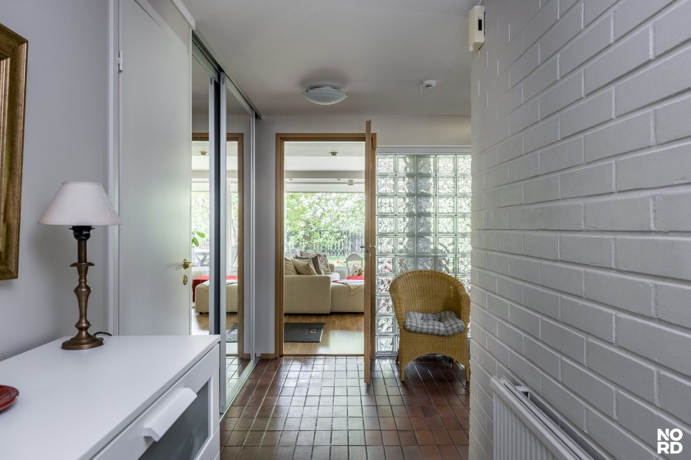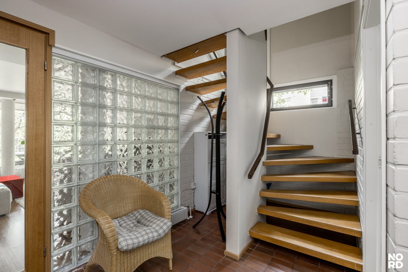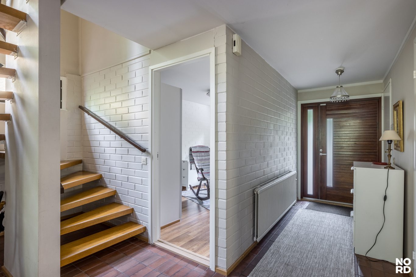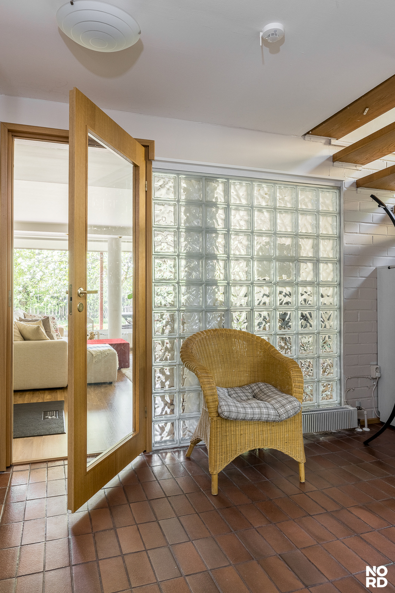 | Tilojen kuvaus | Eteinen: laattalattiat, seinät maalattu. Alakerran olohuoneen ja eteisen välinen seinä lasitiiltä. |