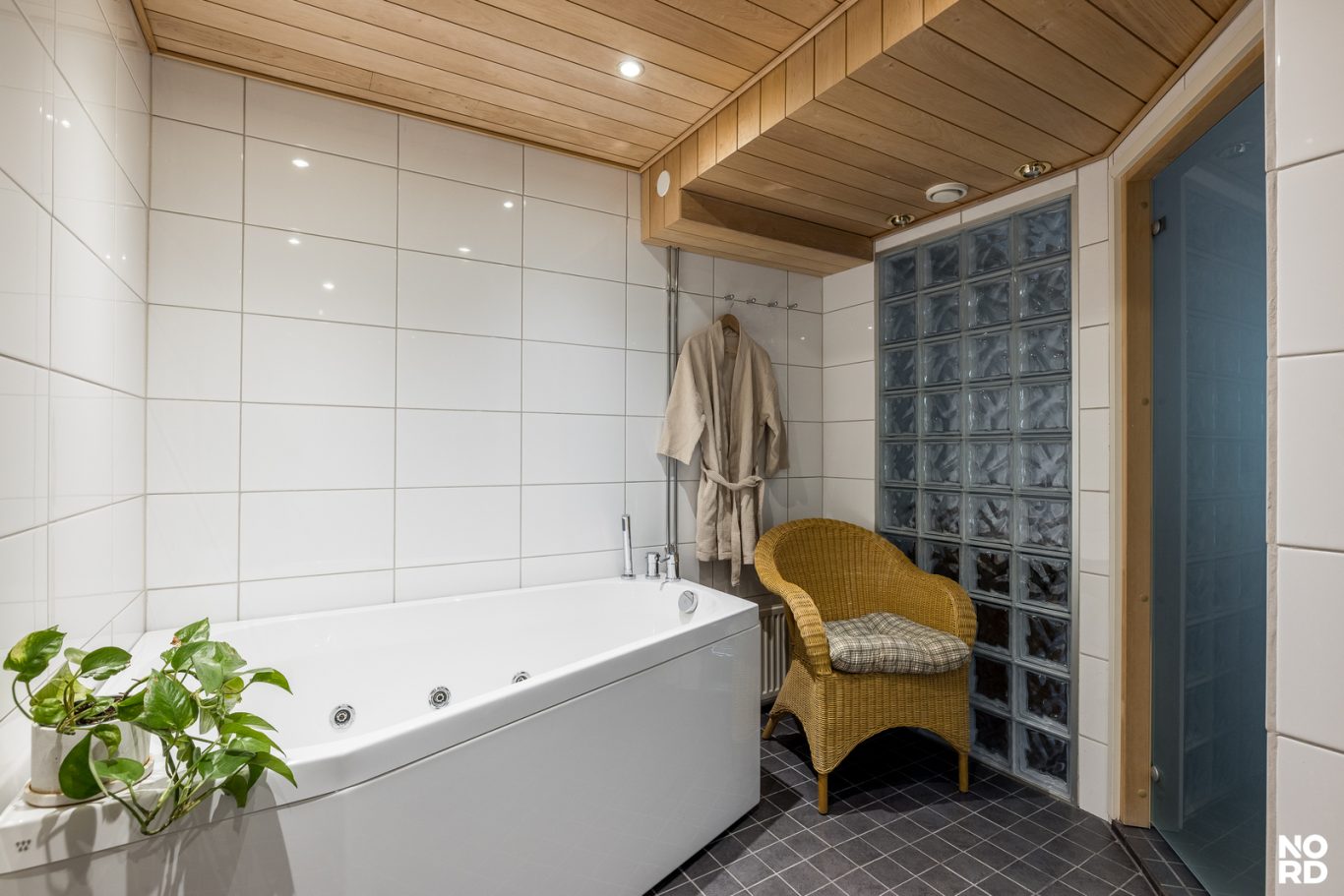 Asunnon ensimmäisessä kerroksessa on työhuone sekä toinen oleskelutila, joka on jaettu kaapistoilla arkiolohuoneeksi ja kuntoiluhuoneeksi. Valoa tilaan tuovat suuret ikkunat ja oleskelutiloista pääseekin suoraan katetulle terassille ja omalle suojaisalle pihalle. Ensimmäisestä kerroksesta löytyy myös upea spa-tyylinen kylpyhuone saunalla ja poreammeella sekä erillinen wc. Kylpyhuoneen vieressä on juuri uusittu kodinhoitohuone, jossa on paljon kaappeja sekä tilaa pyykkihuollolle.