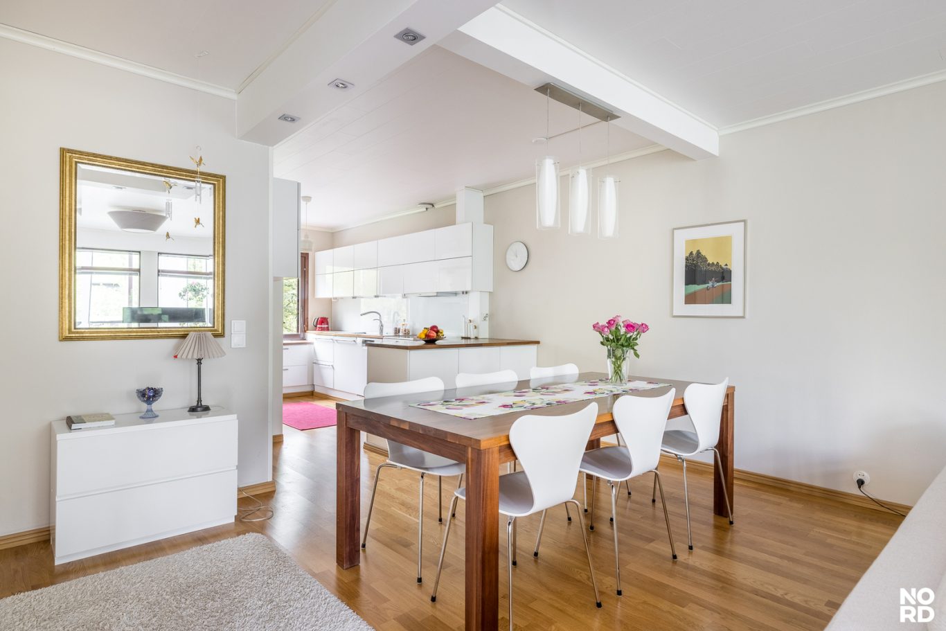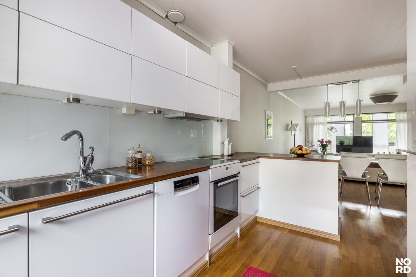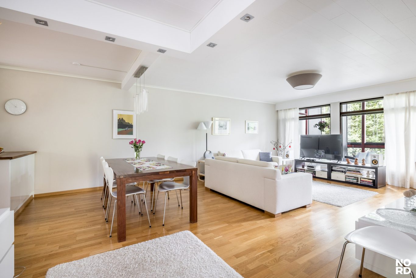 Toisessa kerroksessa olohuone ja ruokailutila yhdistyvät laadukkaaseen, hyvin varusteltuun keittiöön, jossa on reilusti säilytys- sekä laskutilaa. Korkeat huoneet ja suuret ikkunat tuovat oleskelutilaan valoa ja avaruutta ja niistä avautuvat vehreät näkymät. Oleskelutiloista pääsee myös todella reilunkokoiselle ja viihtyisälle lasitetulle parvekkeelle, joka tarjoaa erinomaiset puitteet rentoutumiselle. Asunnon toisesta tasosta löytyy myös kolme tilavaa ja valoisaa makuuhuonetta sekä erillinen wc. Säilytystilaa on runsaasti jokaisessa makuuhuoneessa ja niiden lisäksi on myös kaksi tilavaa ulkovarastoa.