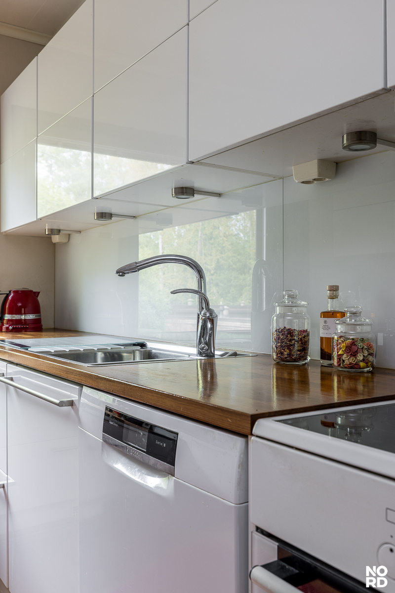 | Tehdyt korjaukset | Muutostöistä on ilmoitettu taloyhtiölle. Rakennusvalvontaviranomaiselta on haettu/saatu lupa. Lopputarkastus on tehty. Korjauksiin liittyvät suunnitelmat ja asiakirjat ovat saatavilla. Keittiö uusittu (-10). Muita remontteja: alakerran wc ja kodinhoitohuone (-24), yläkerran wc (-21), kylpyhuone (-08), uima-allas otettu pois käytöstä (-08), parvekkeiden lasitus. |
