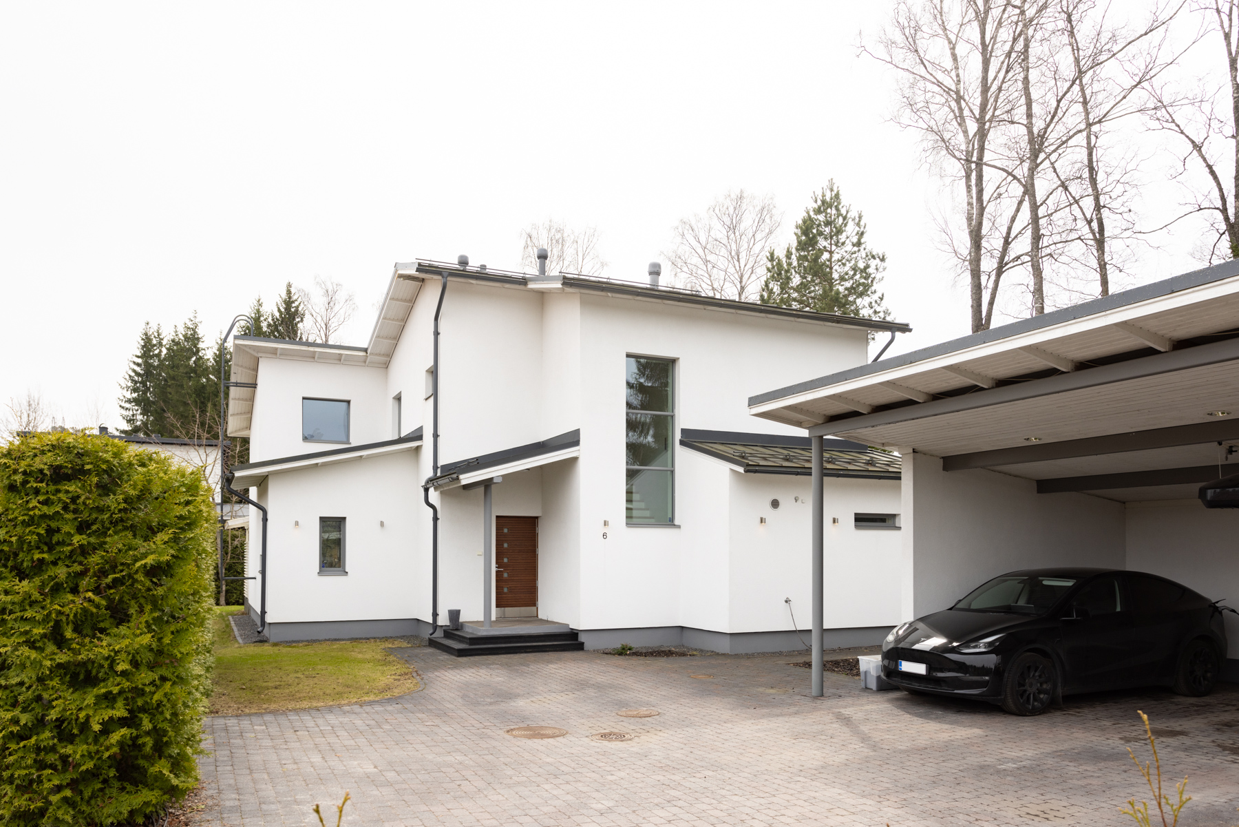 Talo on omalla tontilla päättyvän tien päässä. Piha on asfaltoitu ja autokatoksessa on tilaa kahdelle autolle, sähköauton latausasema kuuluu kauppaan. Poistoilmalämpöpumppu ja aurinkopaneelit tuovat säästöä energiakustannuksissa ja käyttökustannukset ovat muutenkin hyvin kohtuulliset. Kokonaiskustannukset ovat vain noin 340 e/kk sisältäen sähkön, jätemaksun, kiinteistöveron ja vedenkulutuksen.