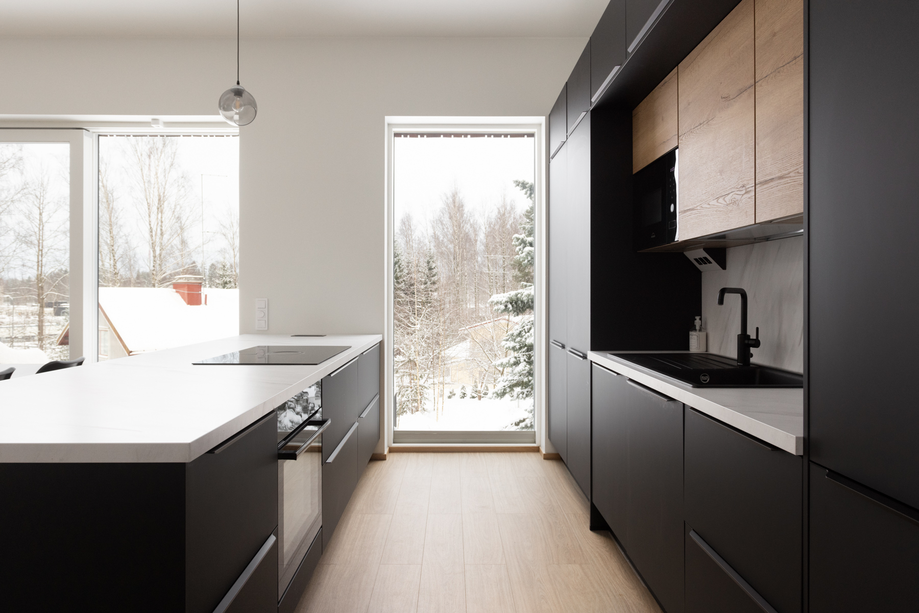 Upea ja esteettisesti kaunis vuonna 2021 valmistunut kivitalo rauhalliselta sijainnilta tarjolla! Tämän asunnon yksityiskohdat ovat tarkkaan mietittyjä ja se on tehty itselle kodiksi. Yläkerran yhtenäinen oleskelutila ja keittiö on henkeäsalpaavan kaunis. Isoista lattiaan asti ulottuvista ikkunoista tulvii valoa sisään ja viiston katon myötä huonekorkeus kohoaa yli neljään metriin! Noblessan tyylikkäästä mustasta keittiöstä löytyy 120 cm leveä aamiaiskaappi, erillinen jääkaappi ja pakastin sekä reilusti säilytystilaa, liedessä on integroitu liesituuletin. Ovien tammikuosi toistuu muissakin tiloissa tuoden yhtenäisyyttä sisustukseen, materiaalit ovat ajattomia ja asunnosta on helppo tehdä omannäköisensä. Olohuoneessa on osittain varaava takka ja sen vierestä on käynti lounaaseen suuntautuvalle terassille. Talo sijaitsee rinteessä ja ilmansuunnan myötä aurinko paistaa koko päivän terassille ja isoista ikkunoista myös sisälle. Ikkunoihin on asennettu kahdesta suunnasta avautuvat kaihtimet, jotka blokkaavat kesällä lämpöä ja talvella kylmyyttä, makuuhuoneiden kaihtimet ovat myös pimentävät. Tyylikkäät rappuset ja lasikaiteet yhdistävät ala- ja yläkerran.